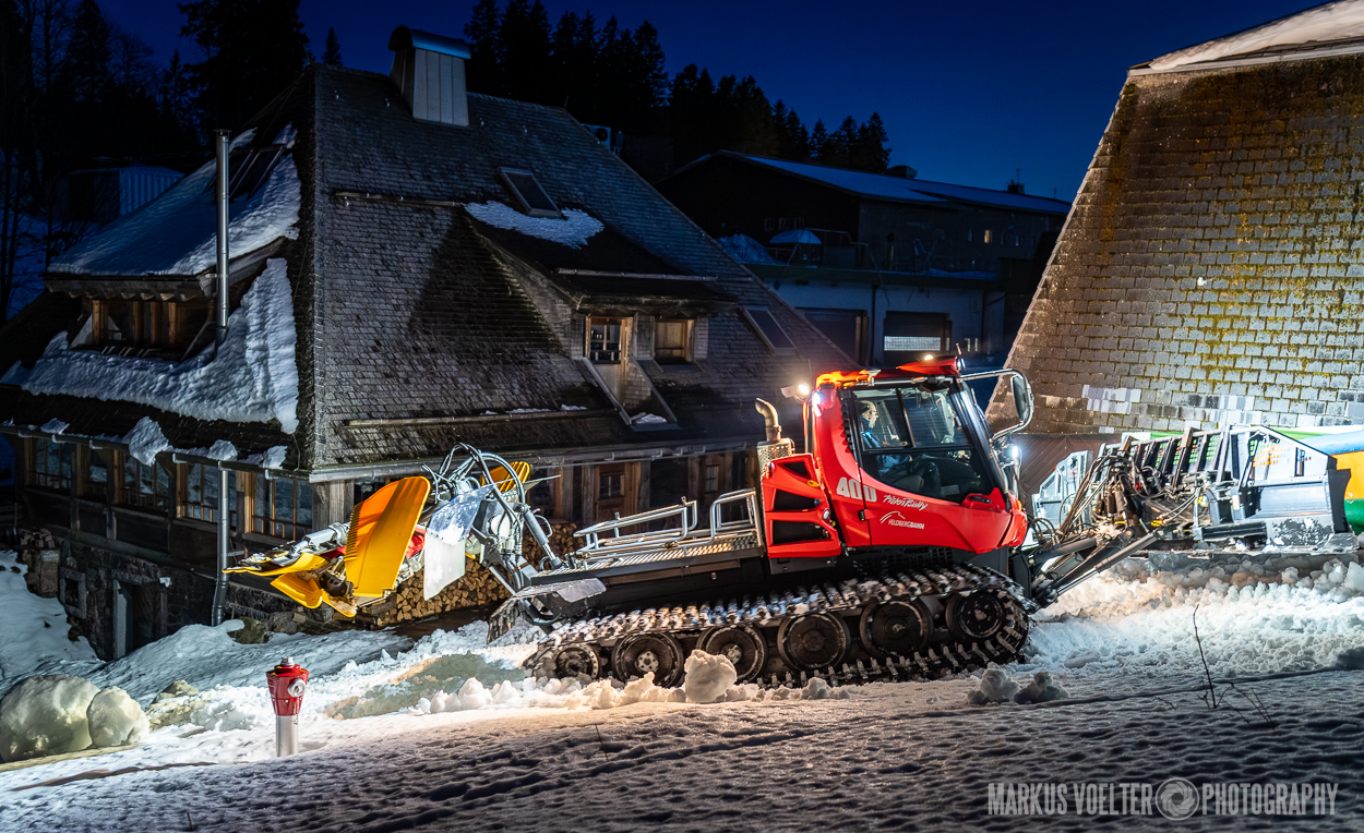 Zwei Probleme: erstens war das am Anfang meiner Fotografiererei und ich habe handwerklich einiges suboptimal bis falsch gemacht. Und zweitens ... naja, es waren halt keine Pistenbullys, sondern die Konkurrenz aus Südtirol. Für mich als Schwabe ist das ein Problem :-) Also musste ich da nochmal ran. Es ist allerdings gar nicht so einfach, Kontakt und Zugang zu bekommen. Über ein paar Ecken kannte ich indirekt jemanden am Feldberg ... und dieser Tage hat es geklappt. Zwischen 17:00 und 23:00 war ich mit Wolfgang, dem "Pistenchef" am Feldberg und seinen Maschinen unterwegs.
