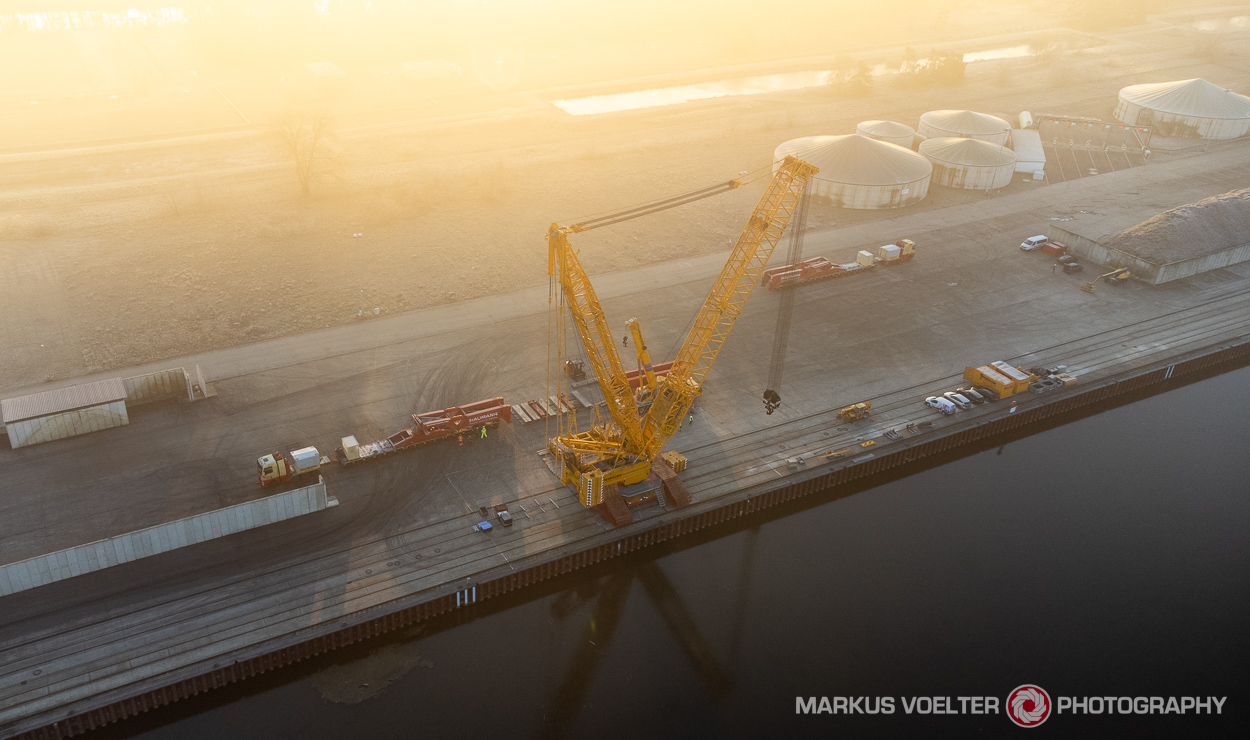 Der Plan war, dass da an dem Montag ein Schiff ist, aus dem der Trafo ausgeladen wird. Leider war der Hafen leer; die Wasserschutzpolizei hat wohl den Verkehr auf der Oder angehalten wegen Nebel. Den Montag haben die Jungs von Baumann also mit Vorbereitungen verbracht, die Leute von Wiesbauer hatten nicht so viel zu tun weil schon alles vorbereitet war.