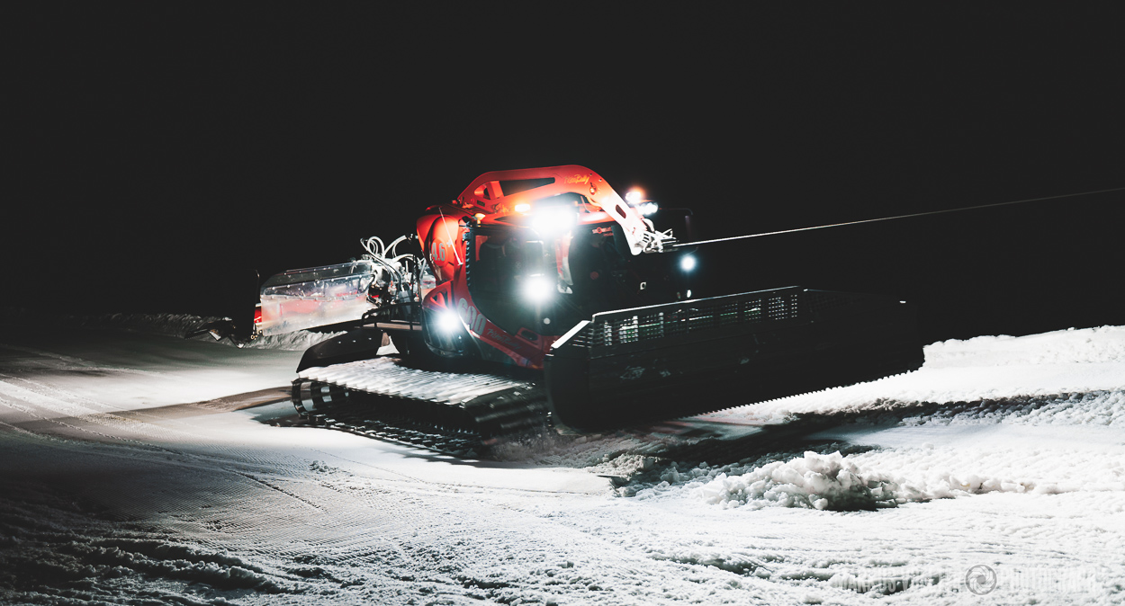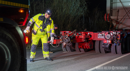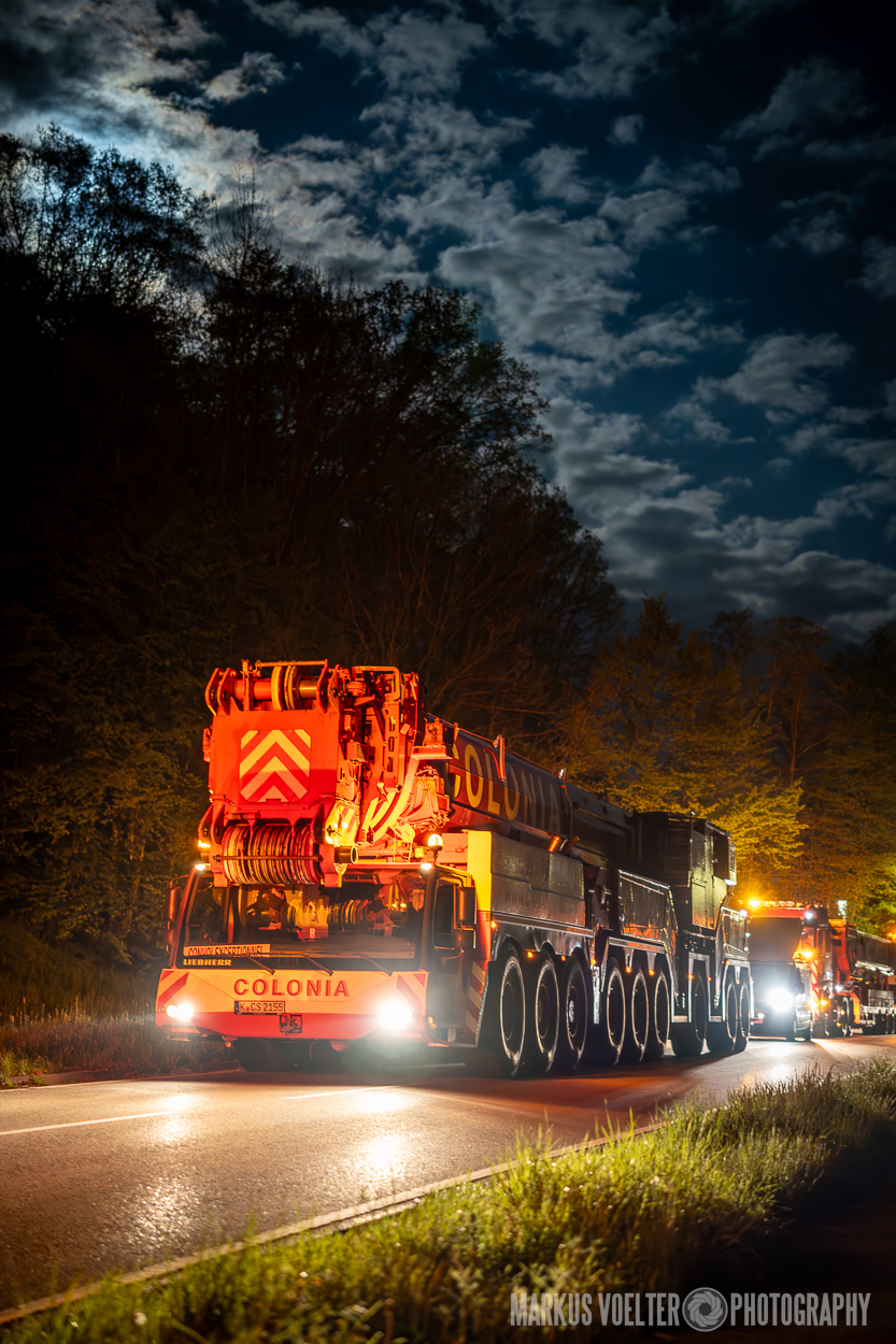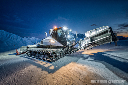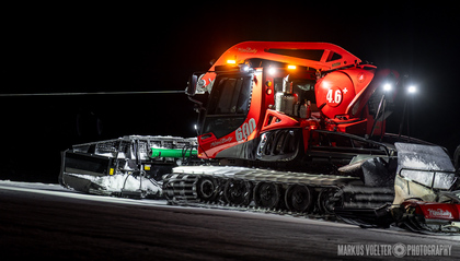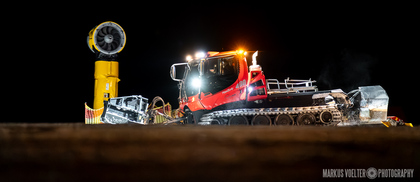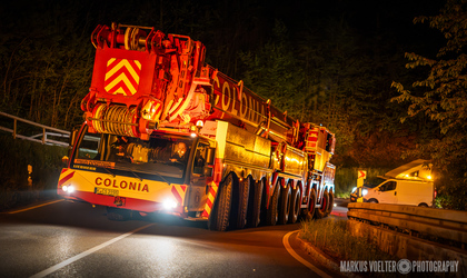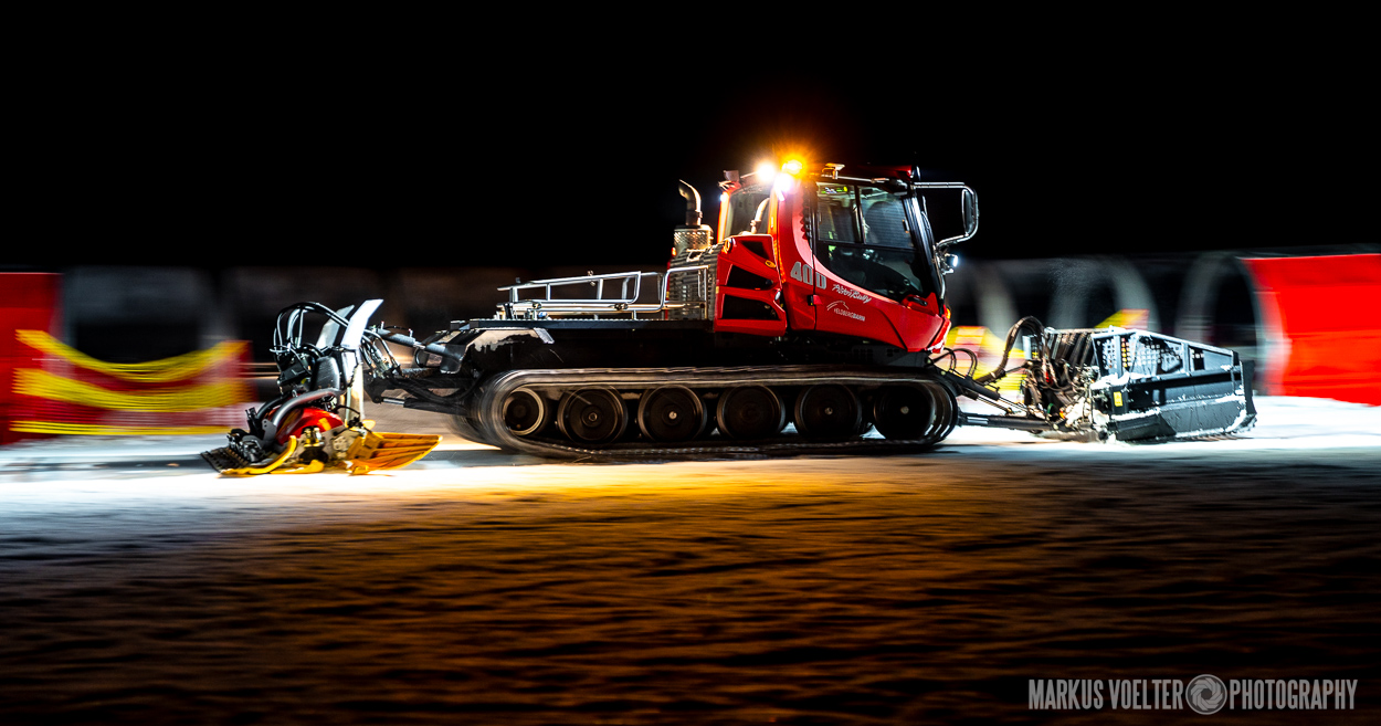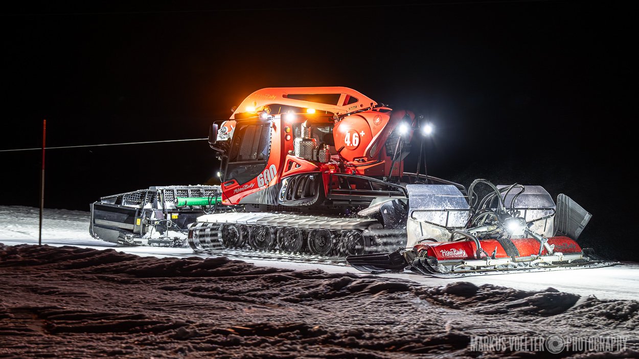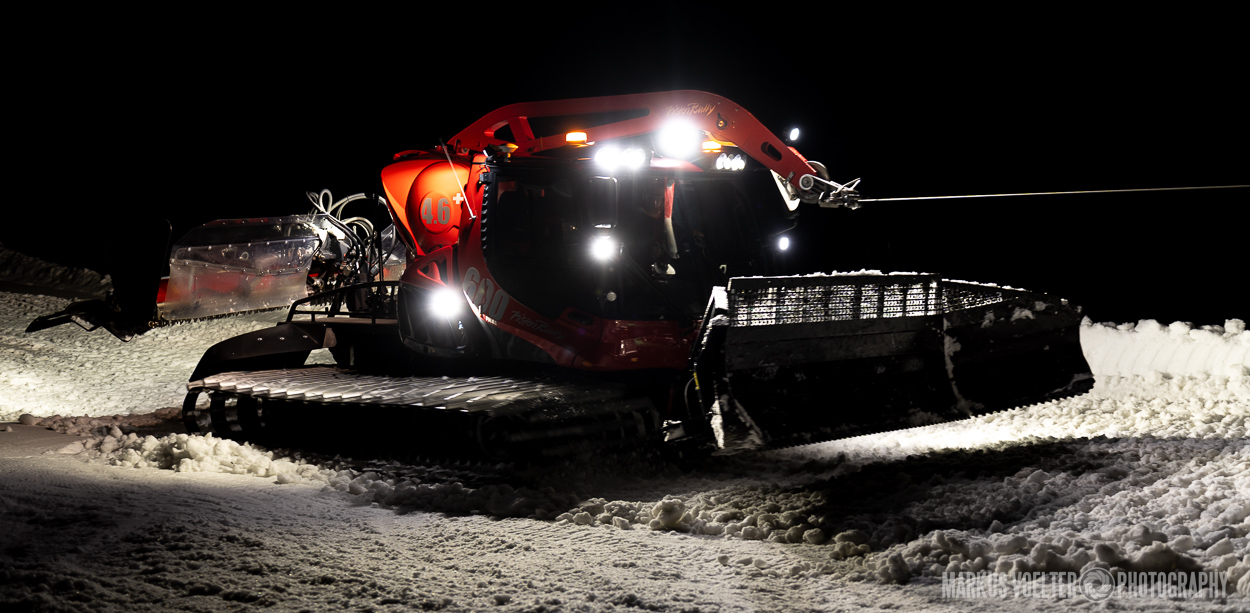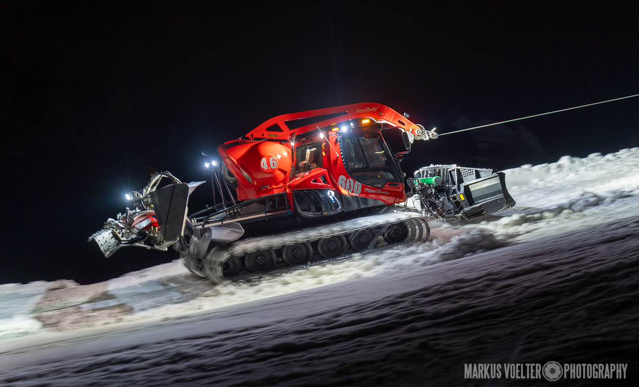 Grade im Bereich Schwertransport und teils auch auf Großbaustellen passiert viel nachts. Aber auch andere Branchen, wie beispielsweise die Präparation von Skipisten, sind nachtaktiv. Fotografisch ist das nicht ohne: lange Belichtungszeiten und resultierende Bewegungsunschärfe sind offensichtlich. Aber nachts sind bekanntlich auch alle Katzen schwarz; Farben sind eine Herausforderung. Gleiches gilt für Scheinwerfer und insbesondere Gegenlicht. Oft liegt die Lösung in der kreativen Bearbeitung der Bilder.