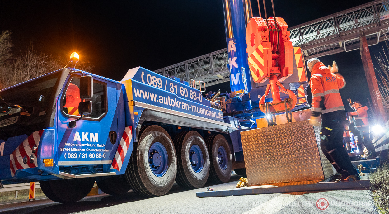 Als ich am Spätnachmittag an der Autobahn ankam waren bereits die jeweils linken Richtungsfahrbahnen mit Hütchen abgesperrt; der Verkehr lief zweispurig über den jeweils rechten Fahrstreifen und die Standstreifen. Pünktlich um 19:00 Uhr (glaube ich) kam die Absperrfirma und hat die Absperrung auf die jeweils rechten Fahrstreifen ausgedehnt, der Verkehr lief nun einspurig über den Standstreifen. Keine fünf Minuten später kamen beide Krane plus Ballast-Sattelschlepper angefahren, jeweils auf der entsprechenden Richtungsfahrbahn. Sämtliches Material war auf Parkplätzen in der Nähe bereitgestellt, sodass die Fahrzeuge mit Sicherheit pünktlich ankommen würden. Die Jungs haben sofort mit dem Aufbau der Krane begonnen. Es eilte ein bisschen, denn die Uhrzeit für die beiden Hübe stand bereits fest. Erst als alles aufgebaut, die Krane an den Brückenteilen angehängt und die Brückensegmente auseinandergeflext waren, kam zur verabredeten Zeit die Polizei hat den Verkehr auf der Standspur kurz angehalten. Während dieser paar Minuten wurden die jeweiligen Brückensegmente angehoben, um 90 Grad gedreht und vor den Kranen auf den gesperrten Fahrstreifen abgelegt. Direkt danach wurde der Standstreifen wieder für den Verkehr geöffnet.