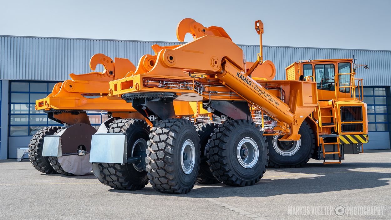Bild 21 kommt in einem Stahlwerk zum Einsatz. Es handelt sich um einen Schlackenkübeltransporter. In seinem U-förmigen Heck nimmt er riesige Kübel mit Schlacke auf, hebt sie an und verfährt sie. Er ist außerdem in der Lage, diese Kübel um die Querachse zu rotieren um sie auszuleeren. Das Fahrzeug ist der erste Schlackenkübeltransporter von Kamag