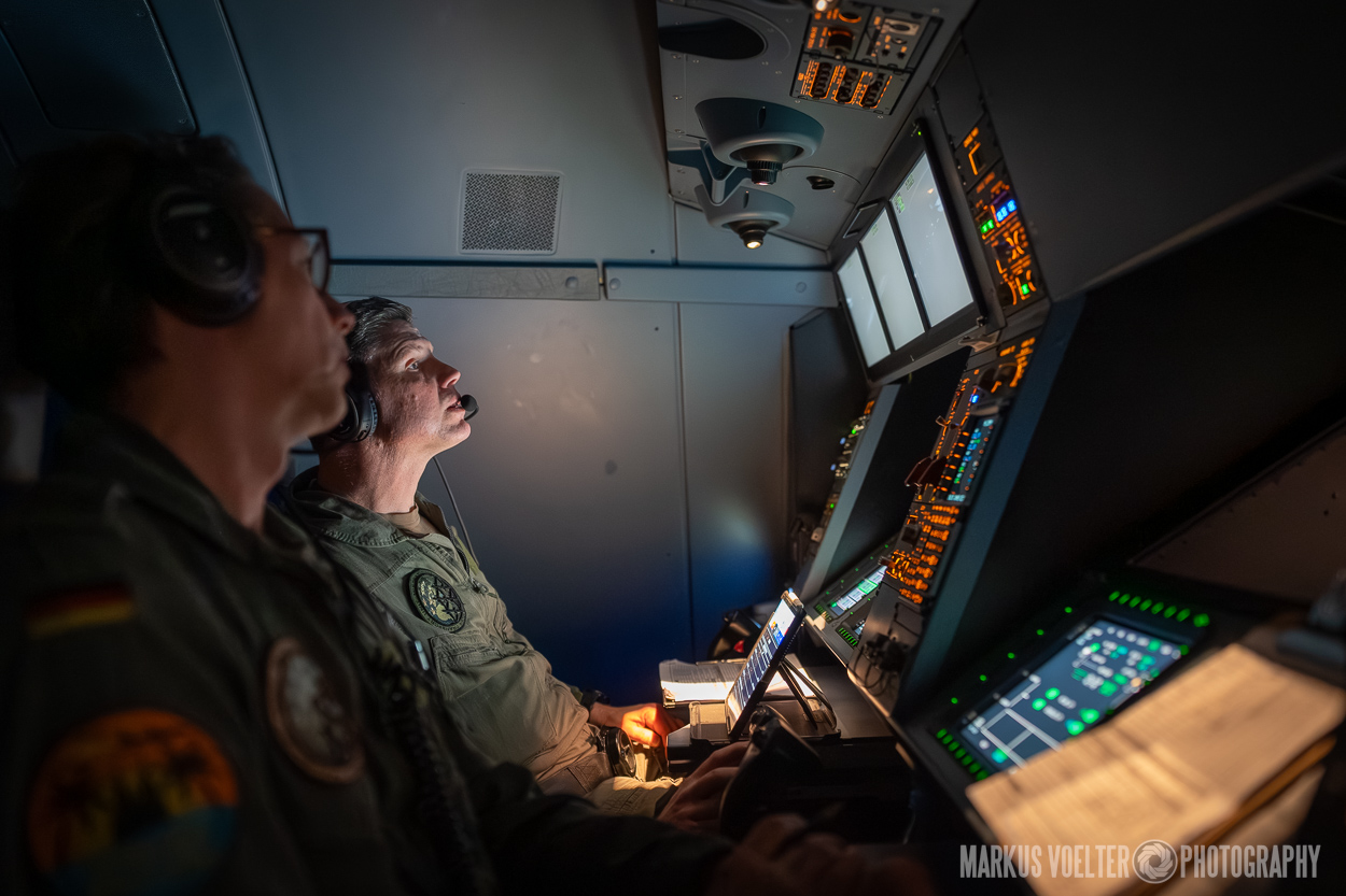 Neben den beiden Piloten besteht die Crew noch aus zwei Air Refuelling Operators. Die sitzen an einer Konsole an der Rückwand des Cockpits uns bedienen die Schläuche sowie den Boom komplett remote mittels Kameras.
