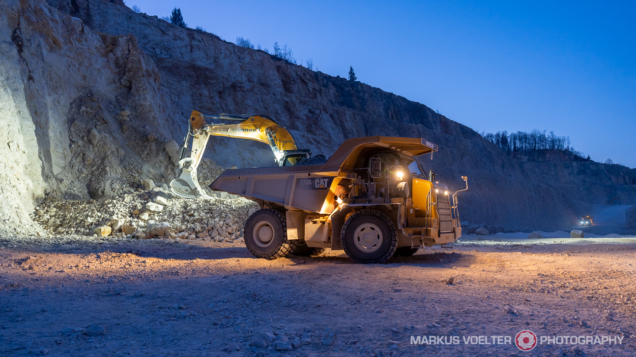 Vorsicht, Hochsicherheitsbereich. Könnte man meinen. Es ist tatsächlich einfacher, auf der Nellis Air Force Base bei laufendem Triebwerk unter einer F-16 rumzukriechen als Zugang zu einem Steinbruch zu bekommen. Der Versicherungsschutz, OMG! Irgendwann habe ich es dann doch mal geschafft bei SH Minerals in Heidenheim (Vielen Dank!). Und wir waren direkt am Morgen verabredet, um die Baumaschinen während der blauen Stunde und im Sonnenaufgang zu erwischen. Knapp zwei Stunden sind wir mit dem Pickup durch den Steinbruch gefahren und haben fotografiert. Hat sich gelohnt, finde ich. Und überfahren wurde ich auch nicht. Puh. Glück gehabt!