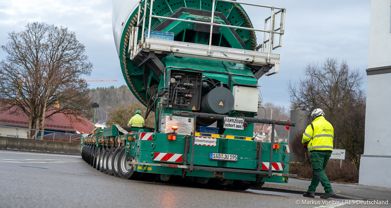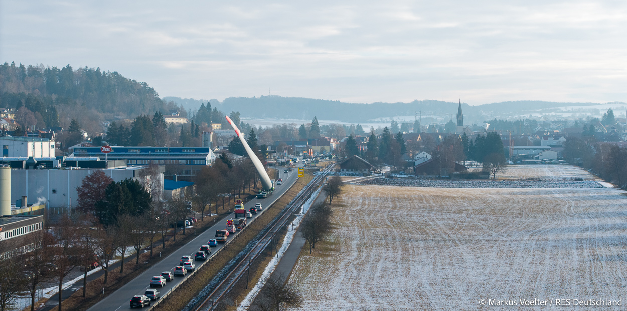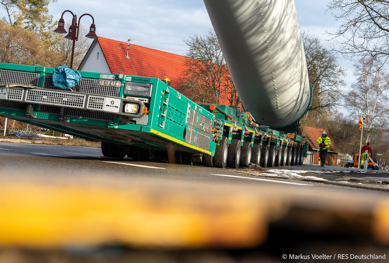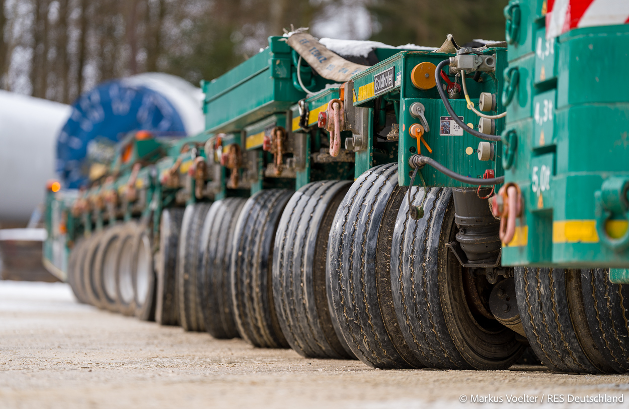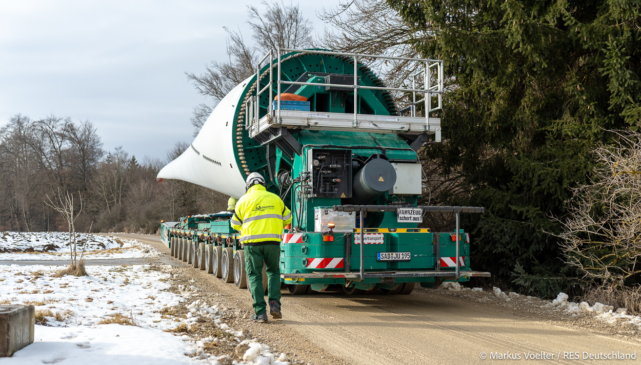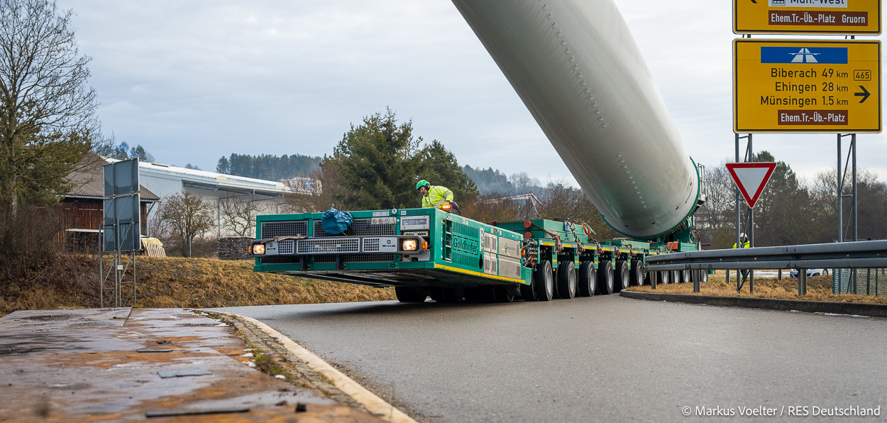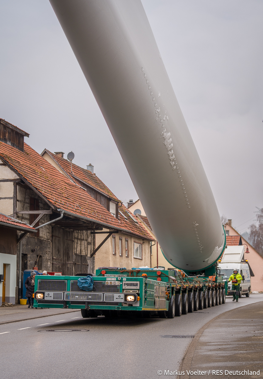 Die Großkomponeten — Turmsegmente, Rotorblätter, Getriebe, etc. — wurden von Schwandner geliefert. Eine "Lieferung" mit drei Rotorblättern und einem Getriebe hat an der Behelfsausfahrt Hohenstadt auf der Alb eine Zwangspause eingelegt, weil die Landstrassen zu glatt waren. Da habe ich die LKW früh morgens erwischt. Es handelte sich um drei Volvo FH16 mit 750 PS, mit Schwerlastturm von Popp Fahrzeugbau. Zum Transport der 81 m langen Rotorblätter an sich kamen Fahrzeuge von Goldhofer zum Einsatz. Der 10-achsige Tieflader für das Getriebe war ein Modell von Broshuis.