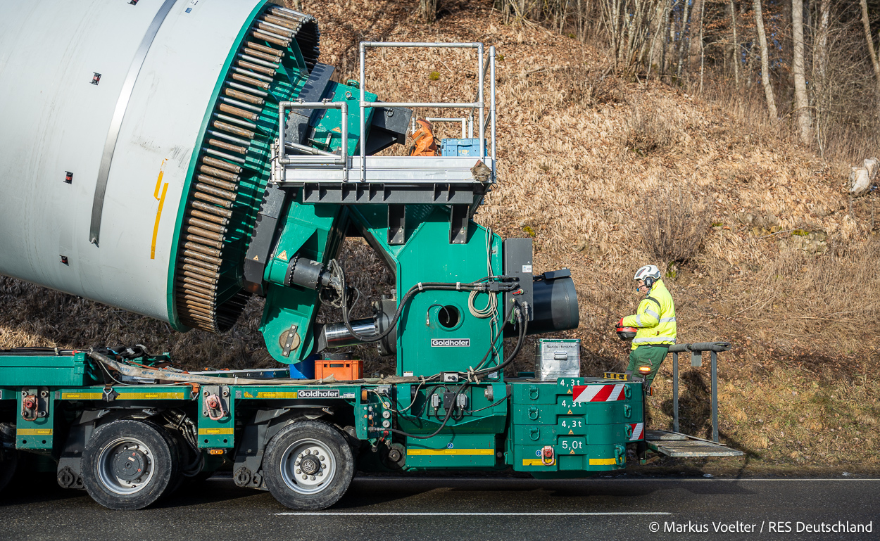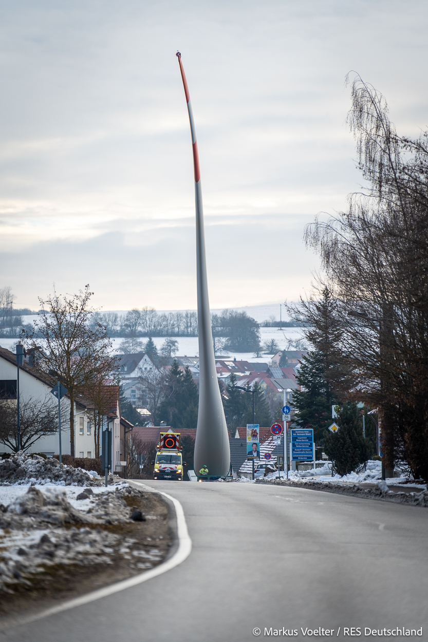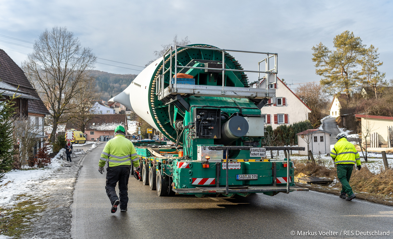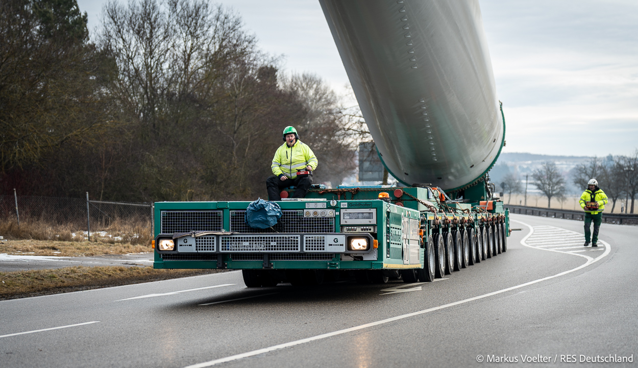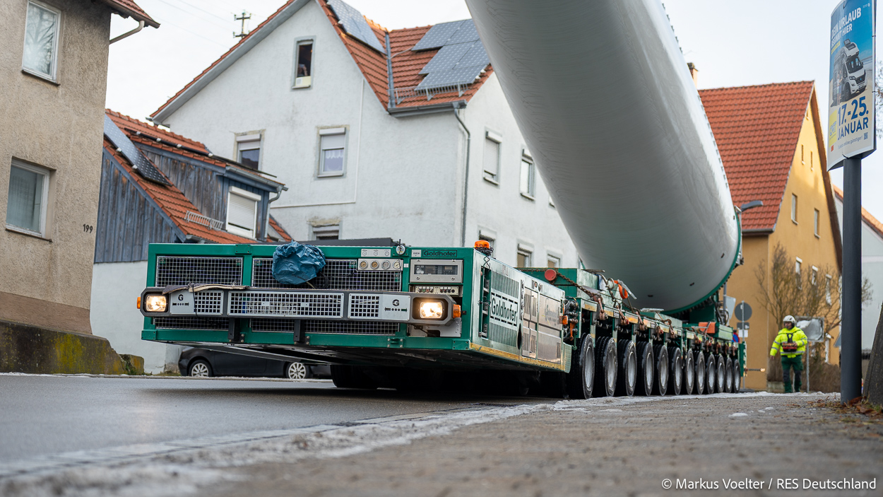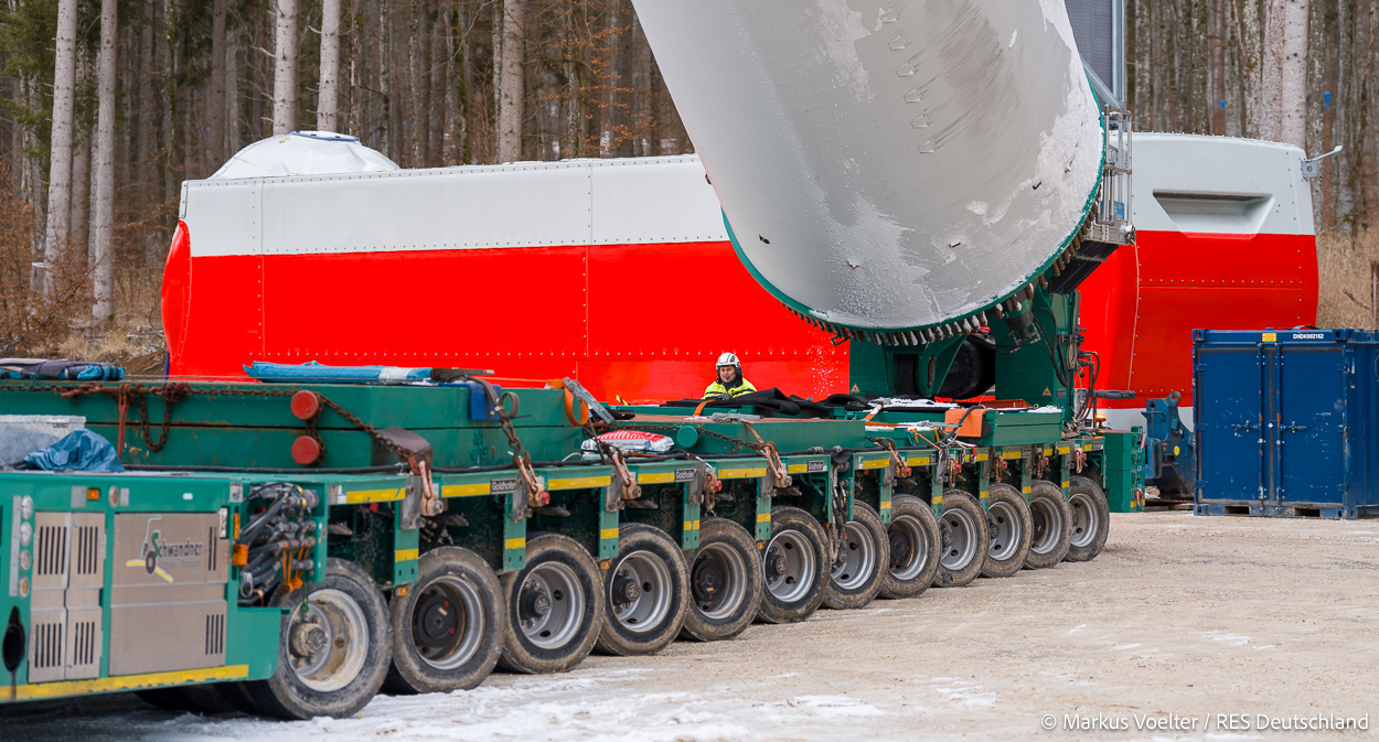 Die Großkomponeten — Turmsegmente, Rotorblätter, Getriebe, etc. — wurden von Schwandner geliefert. Eine "Lieferung" mit drei Rotorblättern und einem Getriebe hat an der Behelfsausfahrt Hohenstadt auf der Alb eine Zwangspause eingelegt, weil die Landstrassen zu glatt waren. Da habe ich die LKW früh morgens erwischt. Es handelte sich um drei Volvo FH16 mit 750 PS, mit Schwerlastturm von Popp Fahrzeugbau. Zum Transport der 81 m langen Rotorblätter an sich kamen Fahrzeuge von Goldhofer zum Einsatz. Der 10-achsige Tieflader für das Getriebe war ein Modell von Broshuis.
