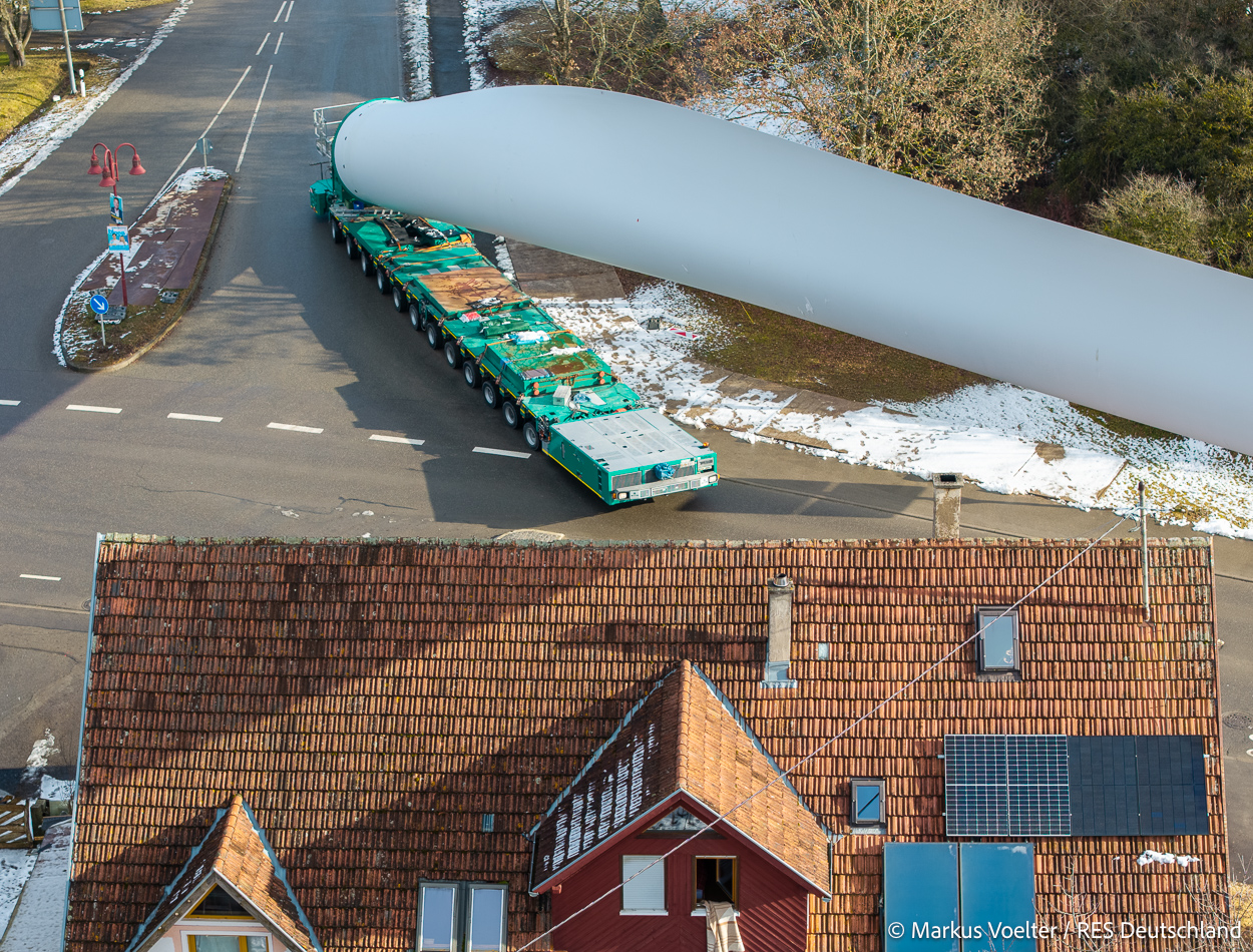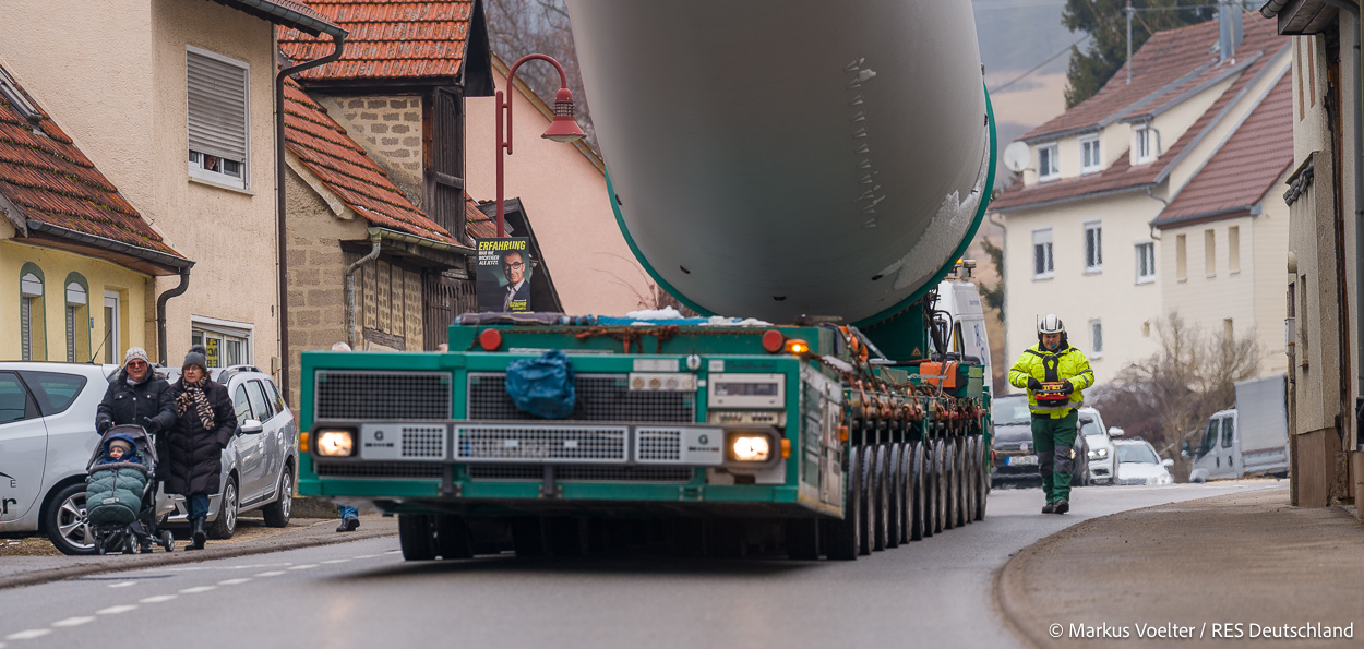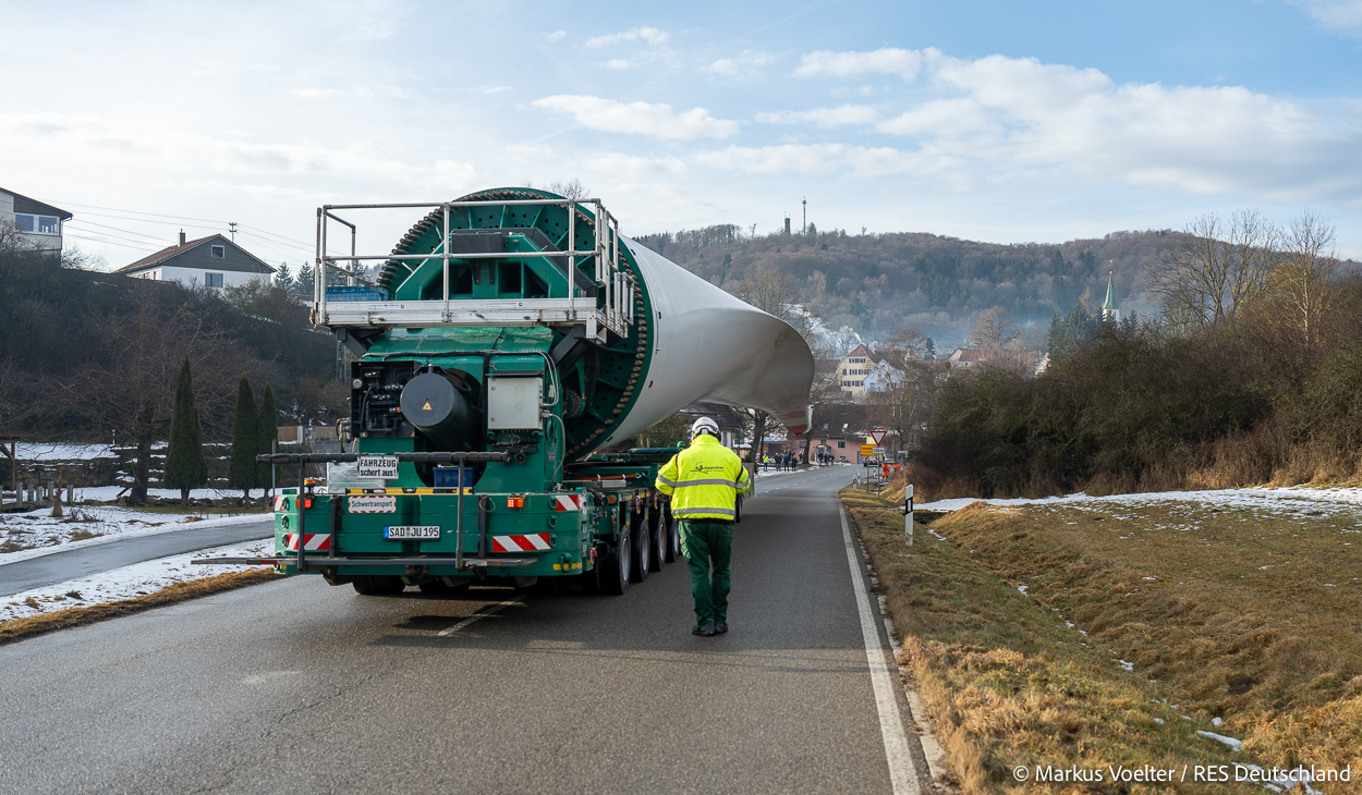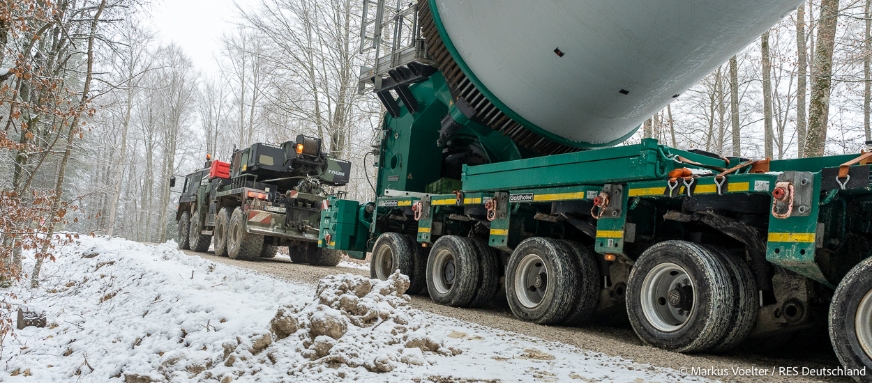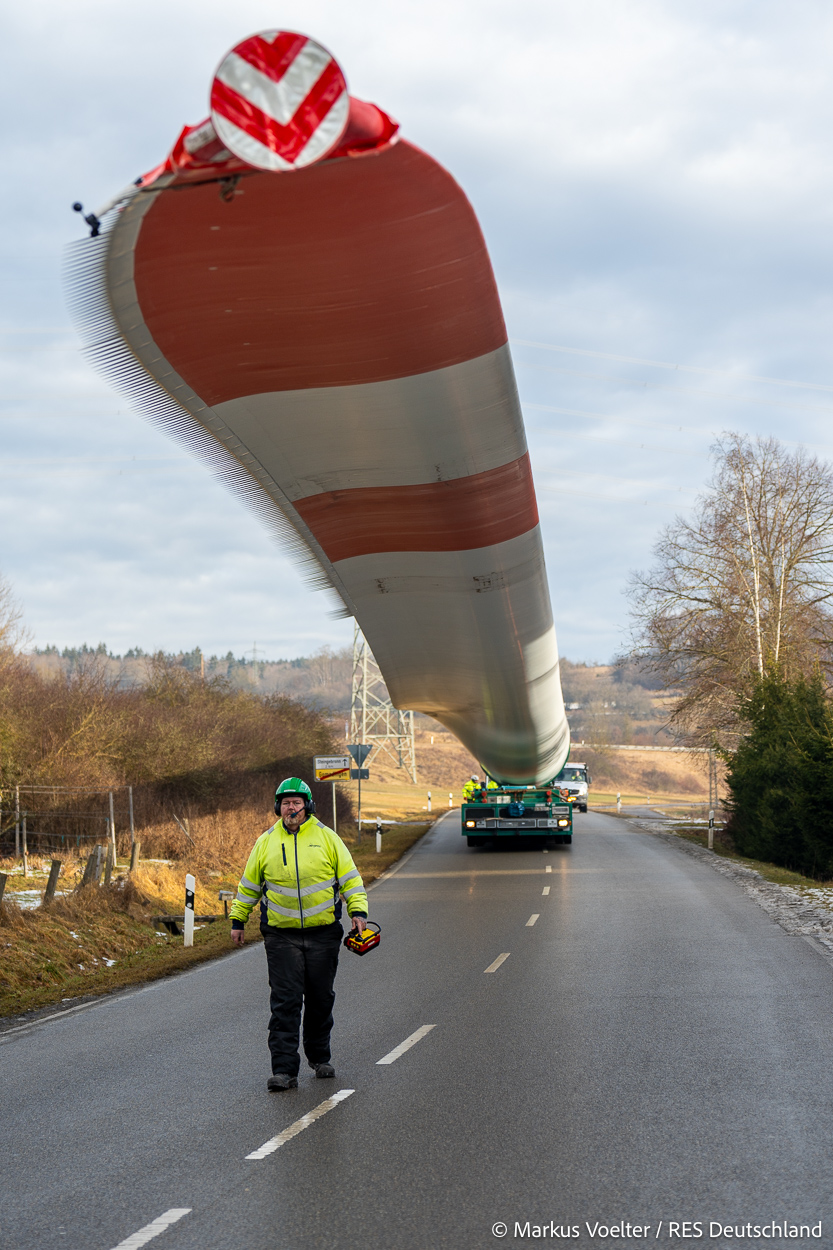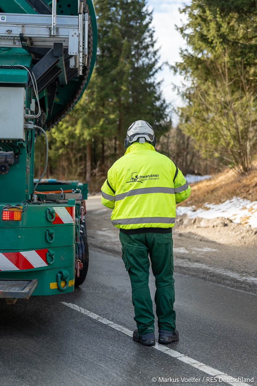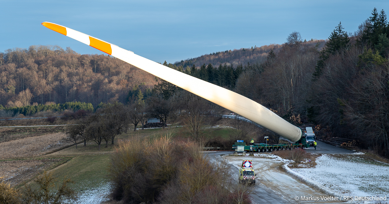 Die Großkomponeten — Turmsegmente, Rotorblätter, Getriebe, etc. — wurden von Schwandner geliefert. Eine "Lieferung" mit drei Rotorblättern und einem Getriebe hat an der Behelfsausfahrt Hohenstadt auf der Alb eine Zwangspause eingelegt, weil die Landstrassen zu glatt waren. Da habe ich die LKW früh morgens erwischt. Es handelte sich um drei Volvo FH16 mit 750 PS, mit Schwerlastturm von Popp Fahrzeugbau. Zum Transport der 81 m langen Rotorblätter an sich kamen Fahrzeuge von Goldhofer zum Einsatz. Der 10-achsige Tieflader für das Getriebe war ein Modell von Broshuis.