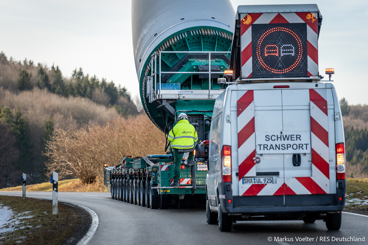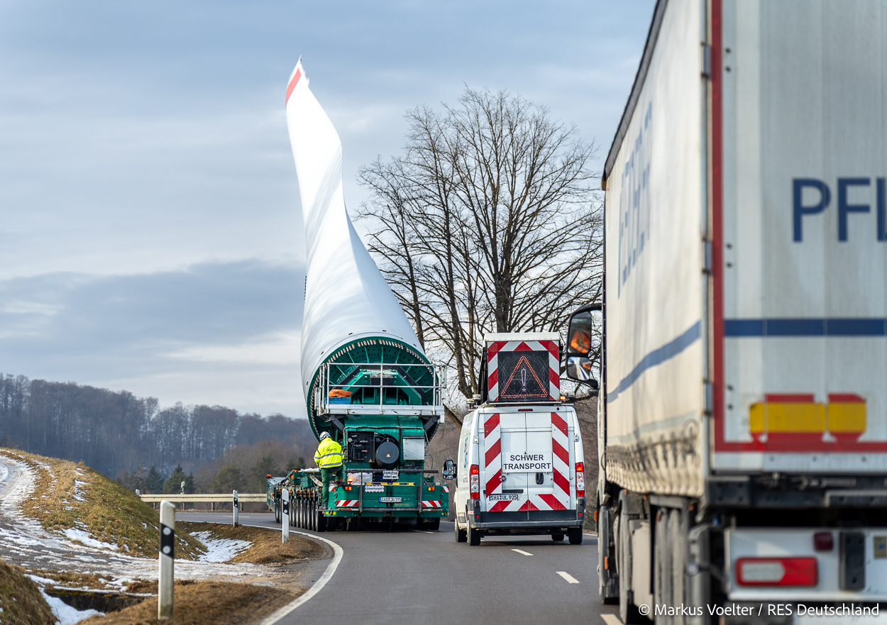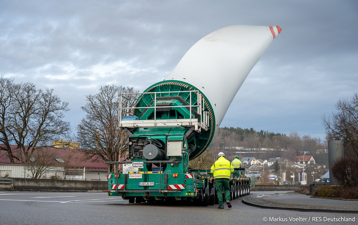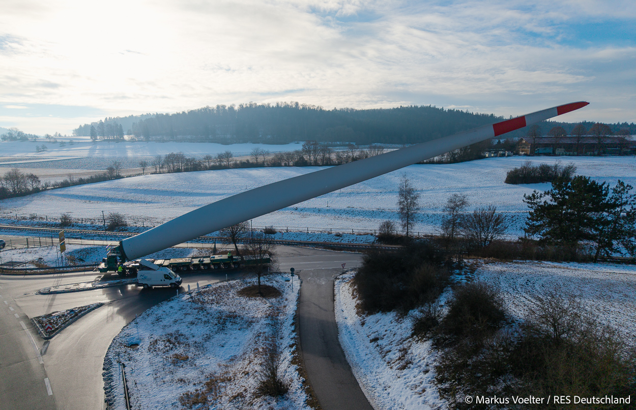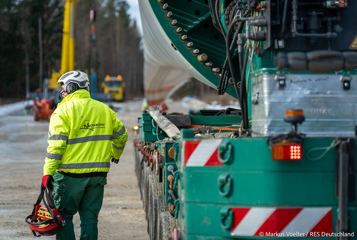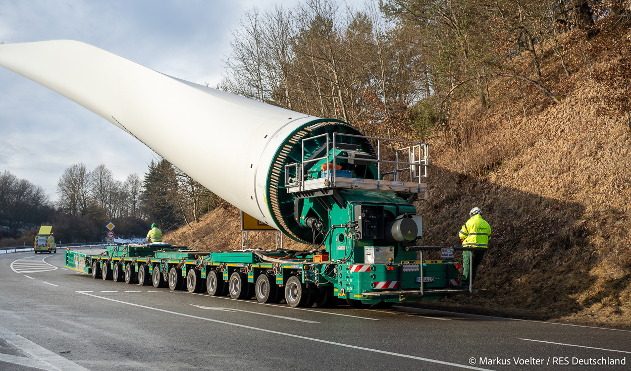 Die Großkomponeten — Turmsegmente, Rotorblätter, Getriebe, etc. — wurden von Schwandner geliefert. Eine "Lieferung" mit drei Rotorblättern und einem Getriebe hat an der Behelfsausfahrt Hohenstadt auf der Alb eine Zwangspause eingelegt, weil die Landstrassen zu glatt waren. Da habe ich die LKW früh morgens erwischt. Es handelte sich um drei Volvo FH16 mit 750 PS, mit Schwerlastturm von Popp Fahrzeugbau. Zum Transport der 81 m langen Rotorblätter an sich kamen Fahrzeuge von Goldhofer zum Einsatz. Der 10-achsige Tieflader für das Getriebe war ein Modell von Broshuis.