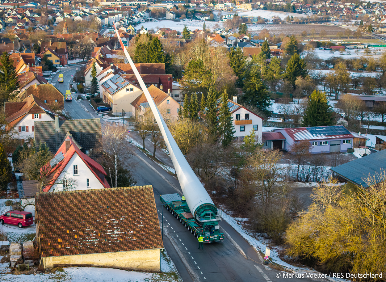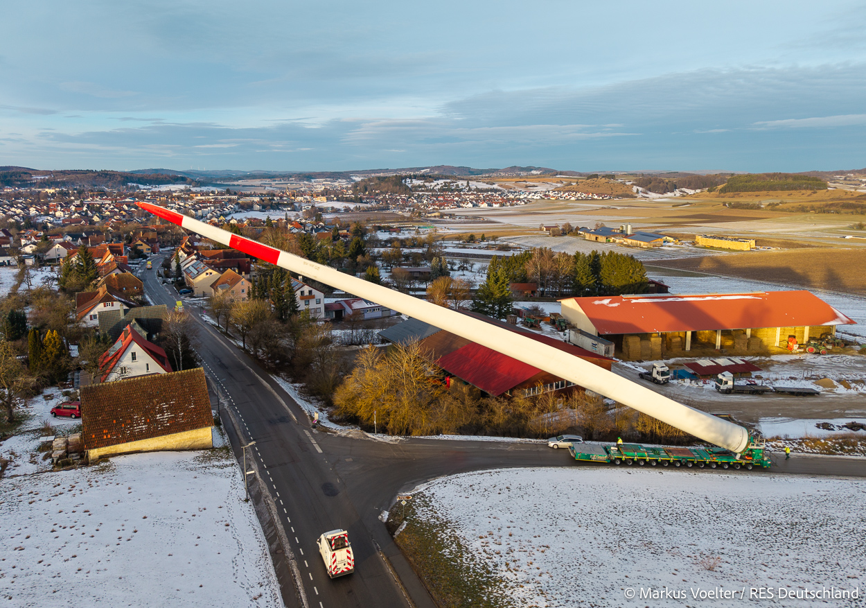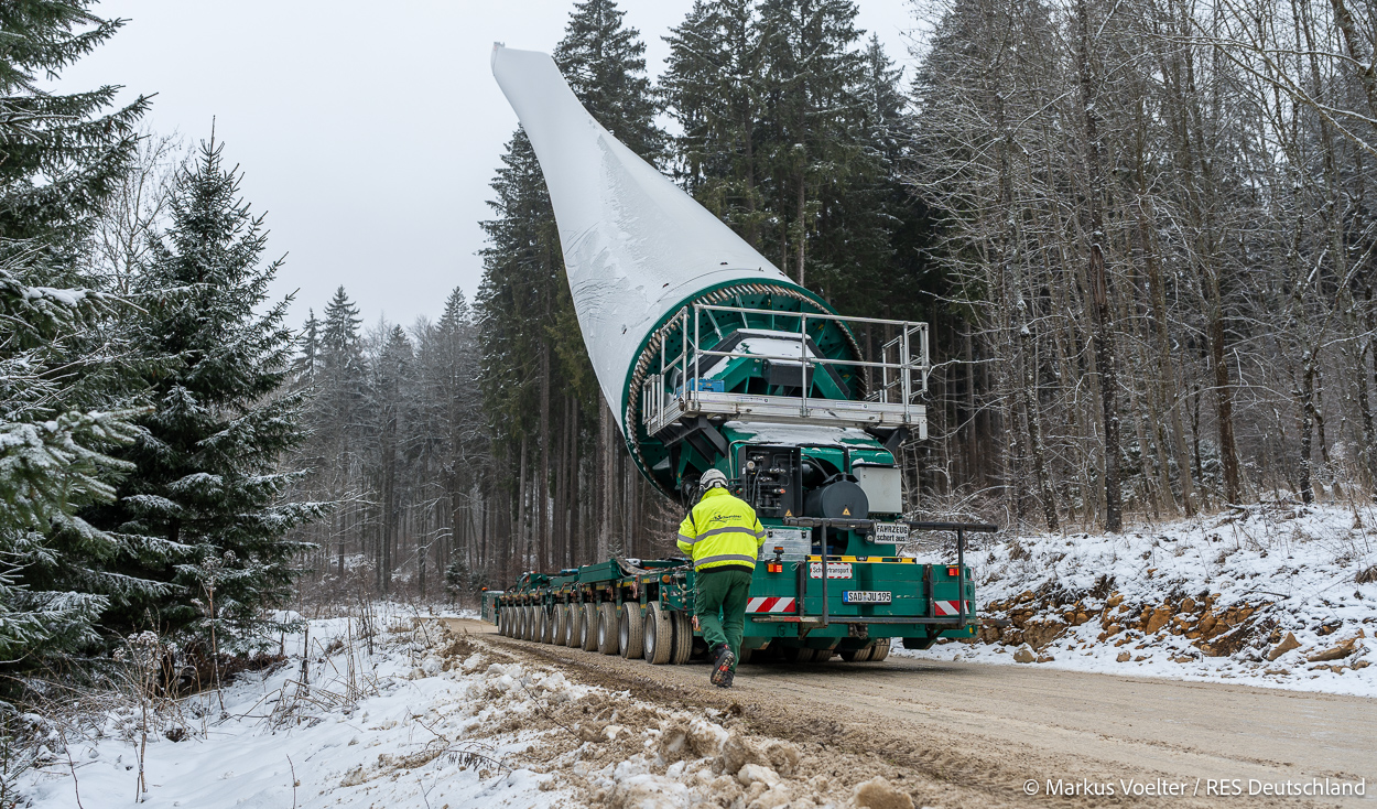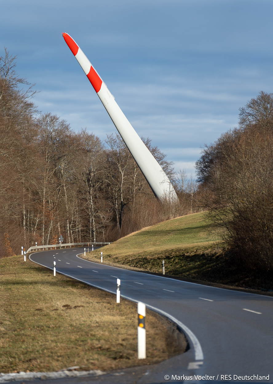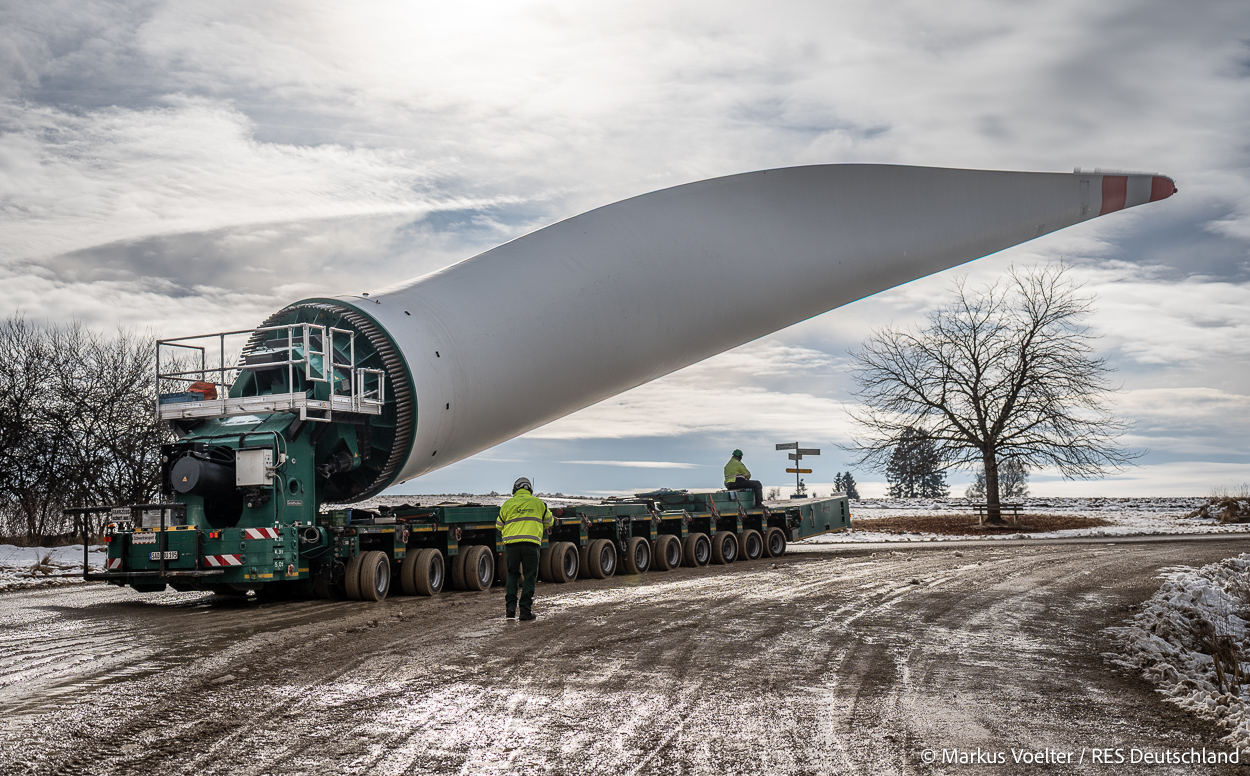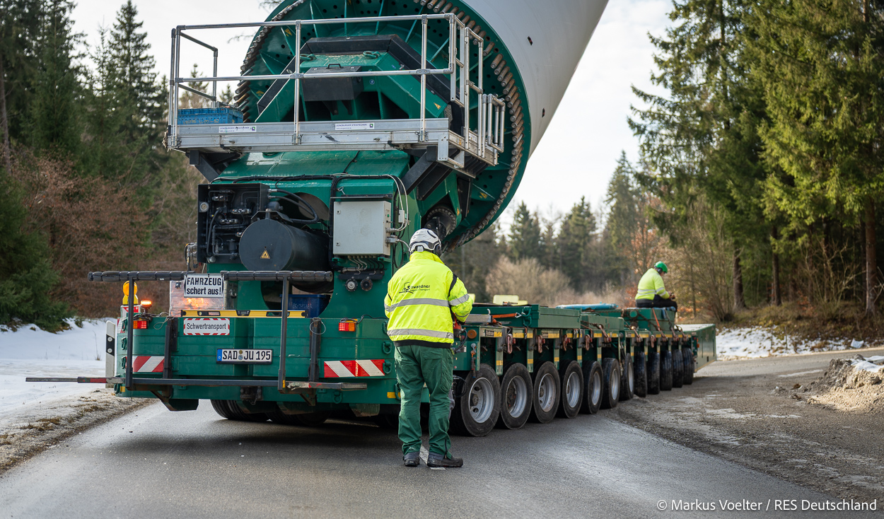 Die Großkomponeten — Turmsegmente, Rotorblätter, Getriebe, etc. — wurden von Schwandner geliefert. Eine "Lieferung" mit drei Rotorblättern und einem Getriebe hat an der Behelfsausfahrt Hohenstadt auf der Alb eine Zwangspause eingelegt, weil die Landstrassen zu glatt waren. Da habe ich die LKW früh morgens erwischt. Es handelte sich um drei Volvo FH16 mit 750 PS, mit Schwerlastturm von Popp Fahrzeugbau. Zum Transport der 81 m langen Rotorblätter an sich kamen Fahrzeuge von Goldhofer zum Einsatz. Der 10-achsige Tieflader für das Getriebe war ein Modell von Broshuis.