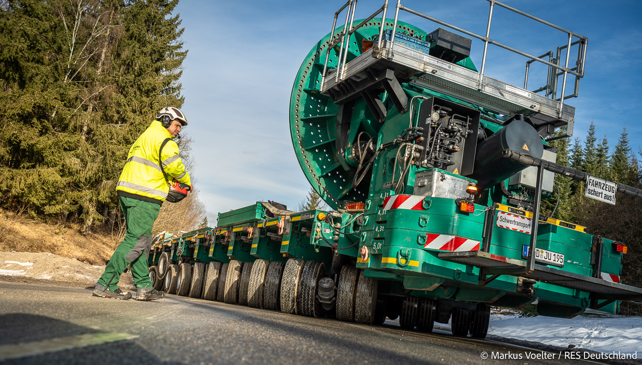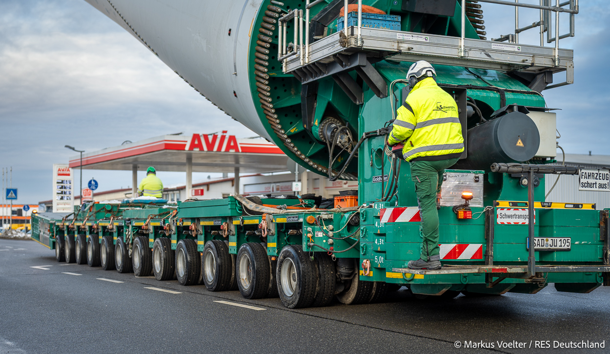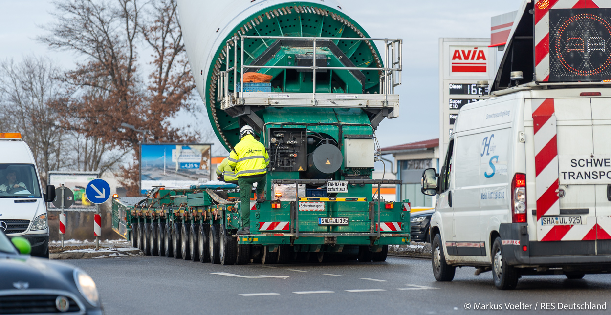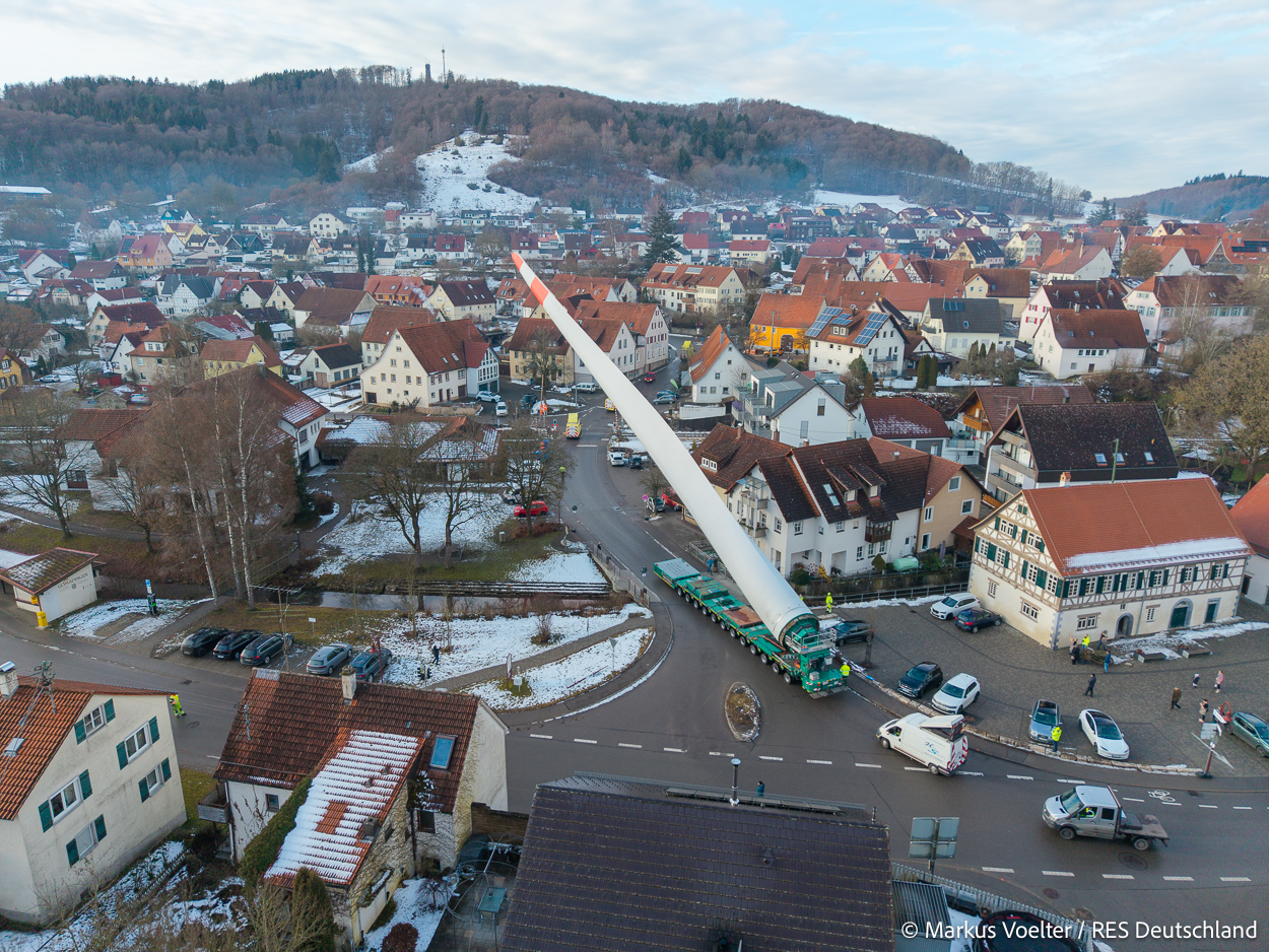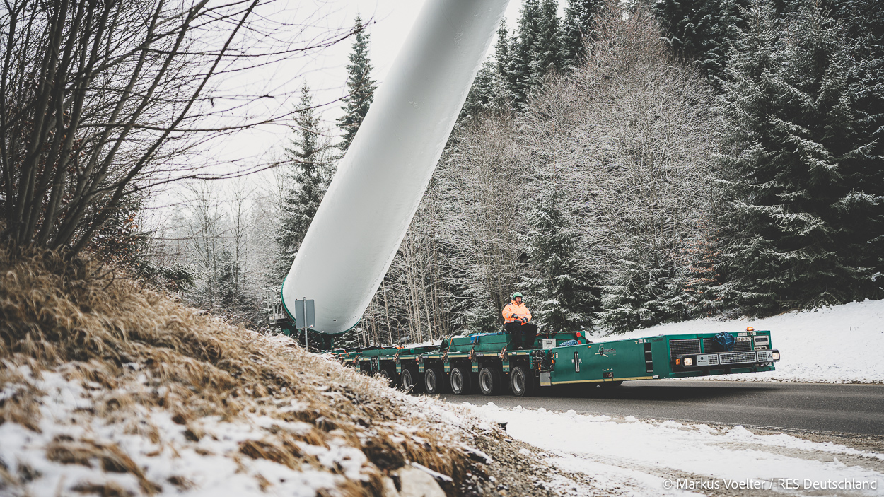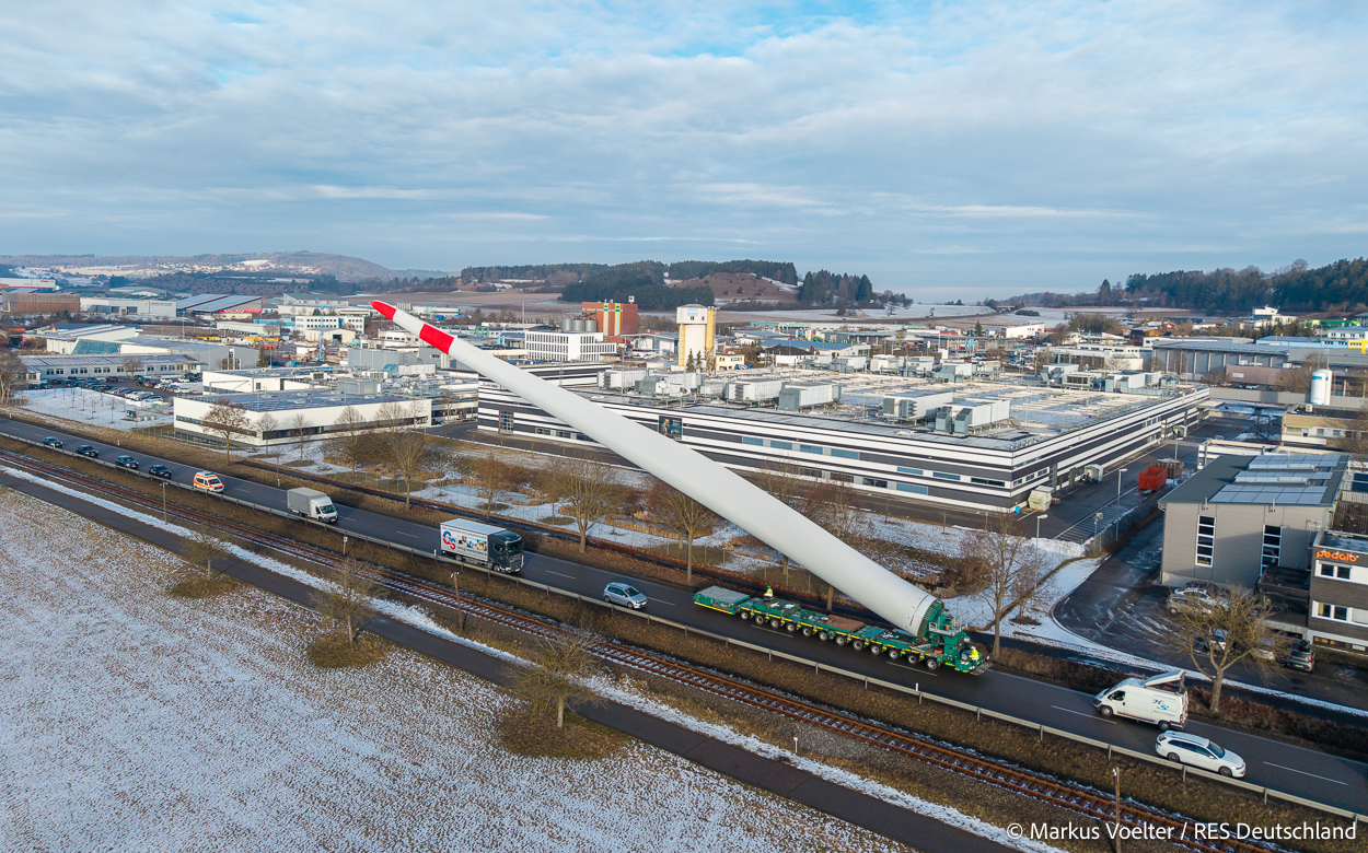 Die Großkomponeten — Turmsegmente, Rotorblätter, Getriebe, etc. — wurden von Schwandner geliefert. Eine "Lieferung" mit drei Rotorblättern und einem Getriebe hat an der Behelfsausfahrt Hohenstadt auf der Alb eine Zwangspause eingelegt, weil die Landstrassen zu glatt waren. Da habe ich die LKW früh morgens erwischt. Es handelte sich um drei Volvo FH16 mit 750 PS, mit Schwerlastturm von Popp Fahrzeugbau. Zum Transport der 81 m langen Rotorblätter an sich kamen Fahrzeuge von Goldhofer zum Einsatz. Der 10-achsige Tieflader für das Getriebe war ein Modell von Broshuis.