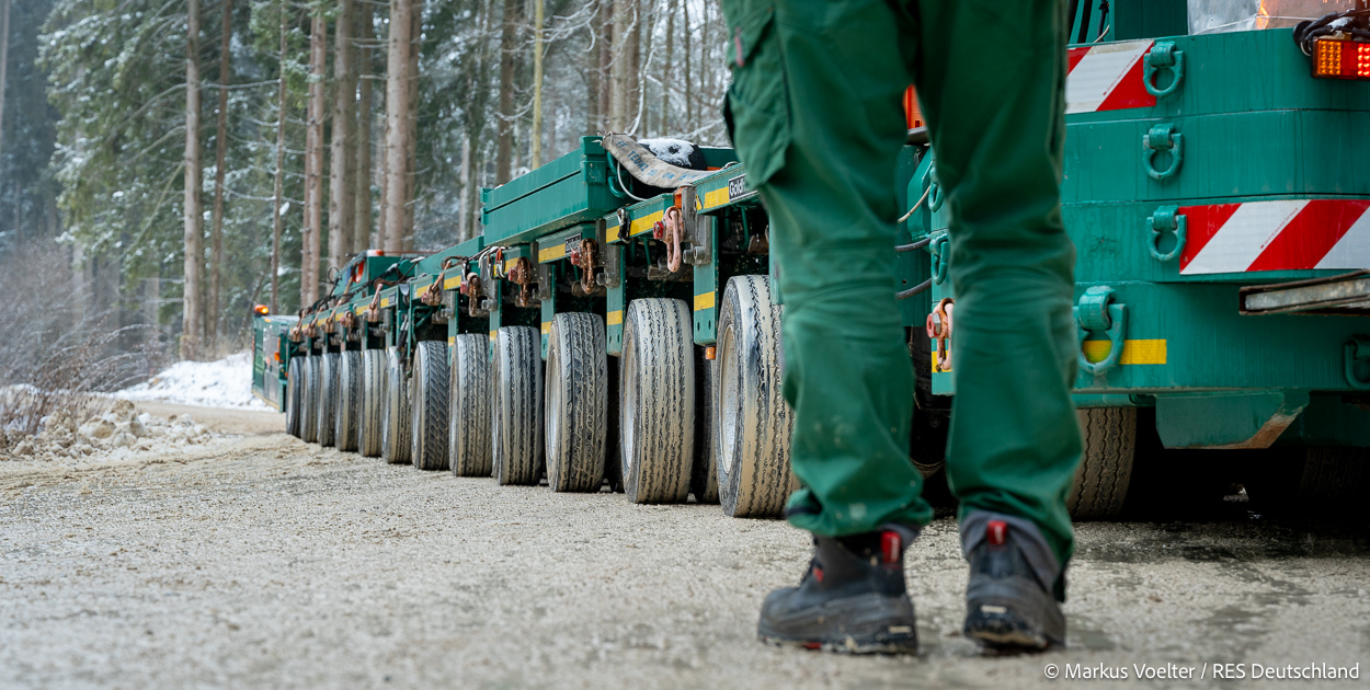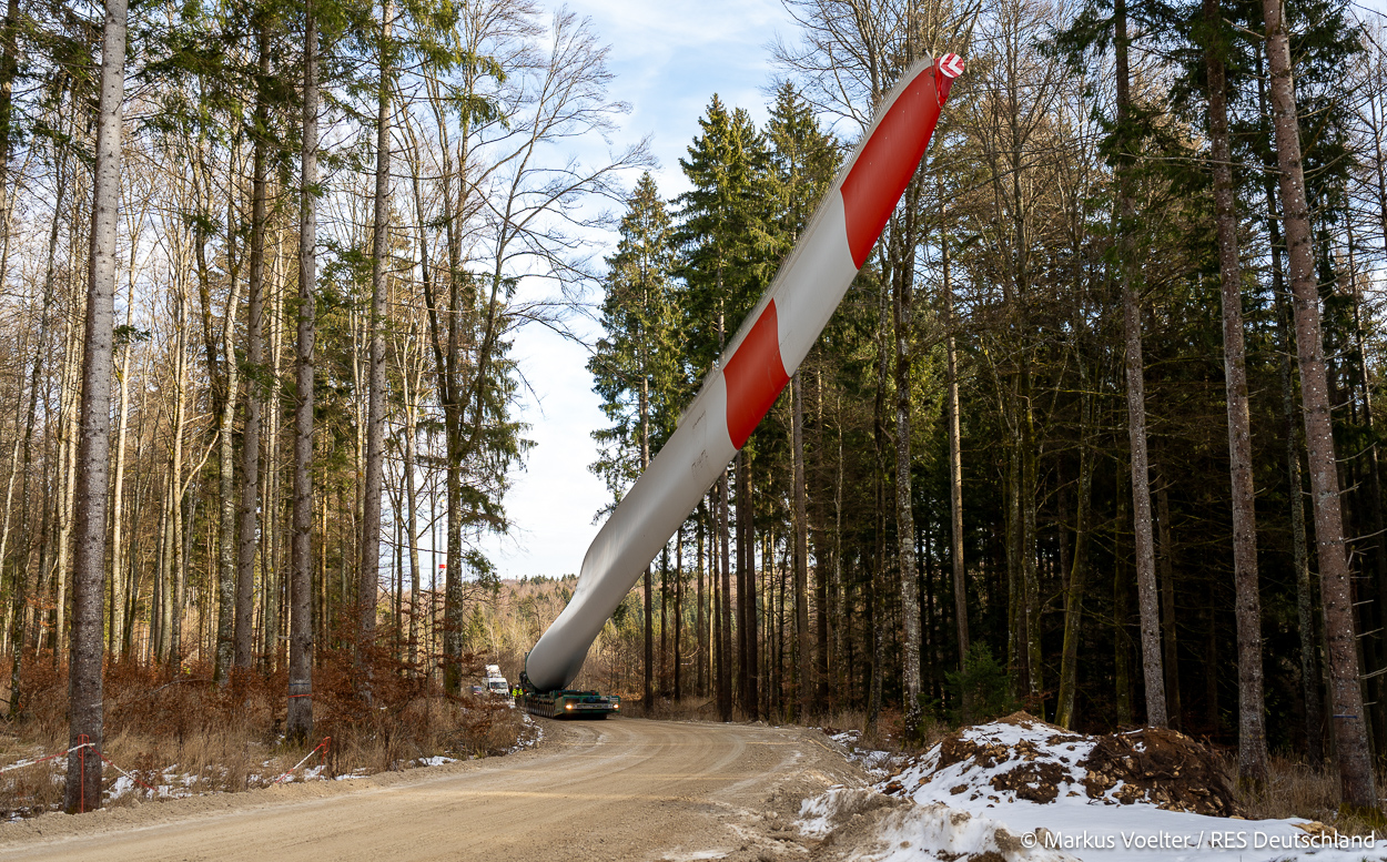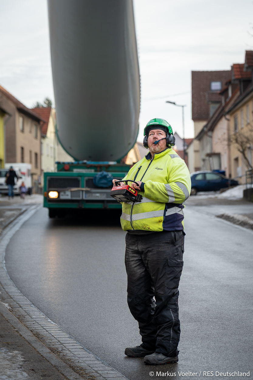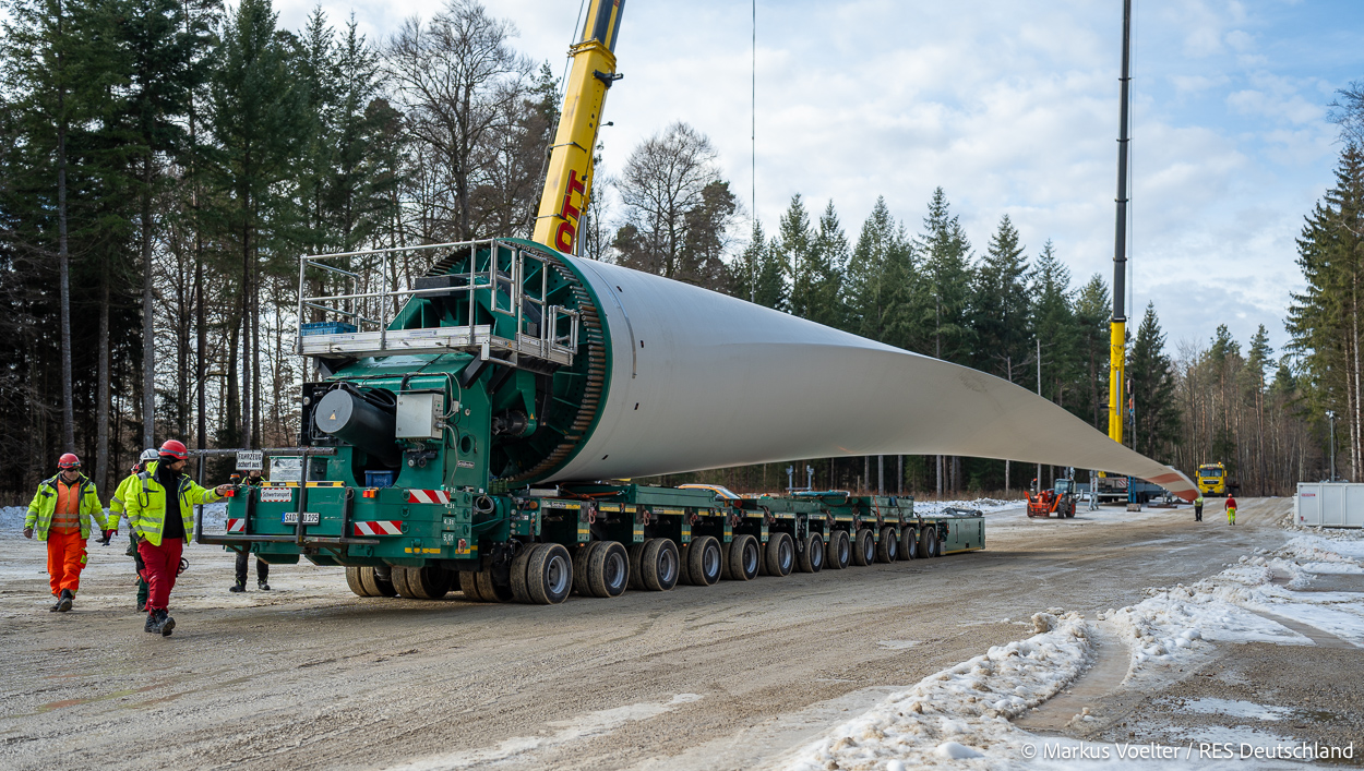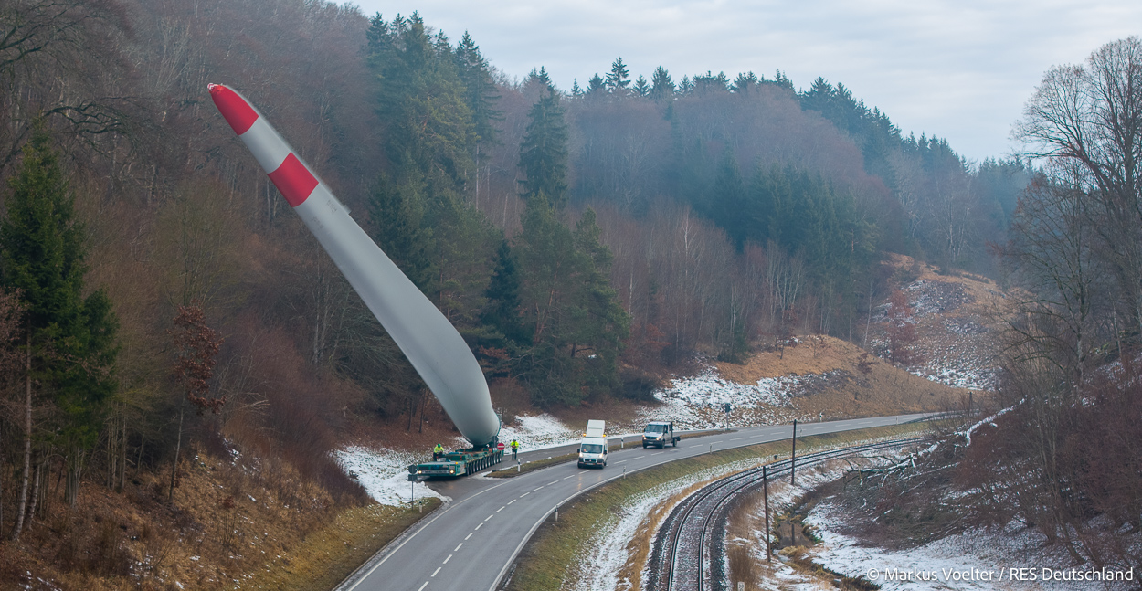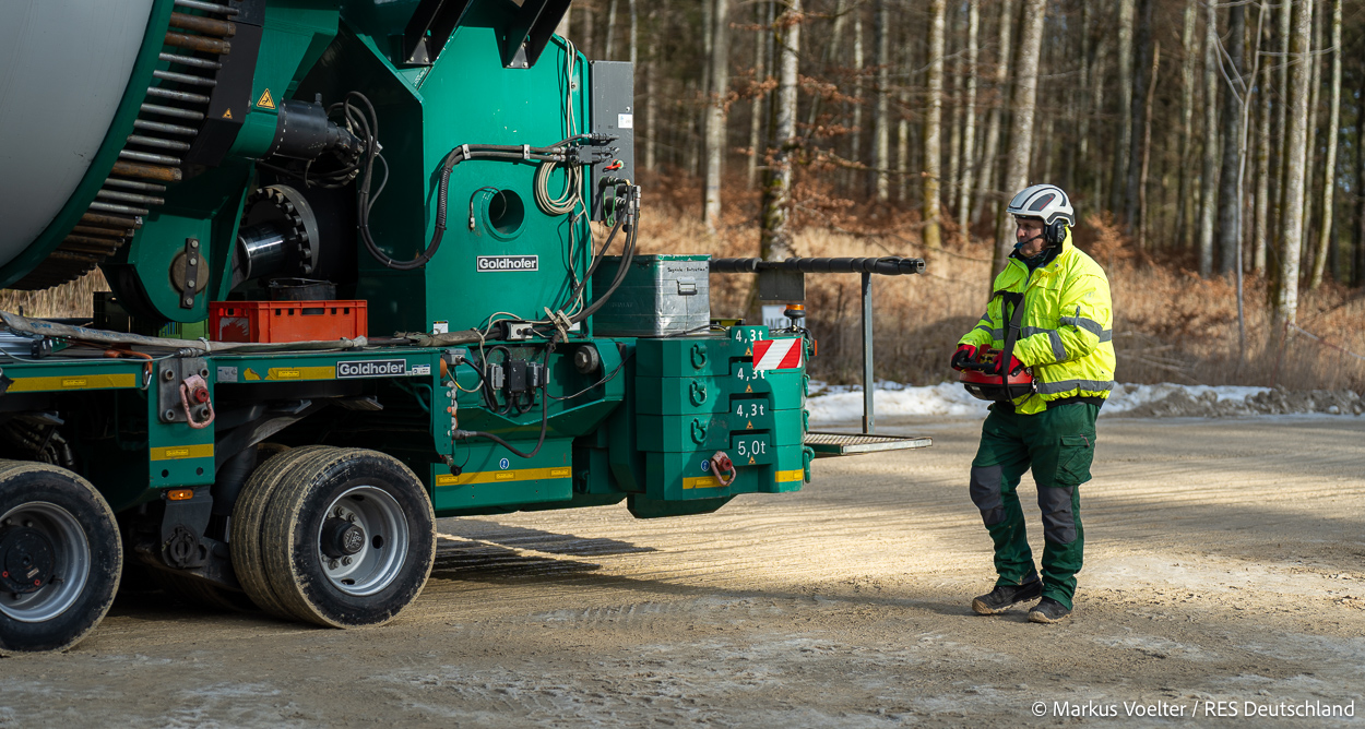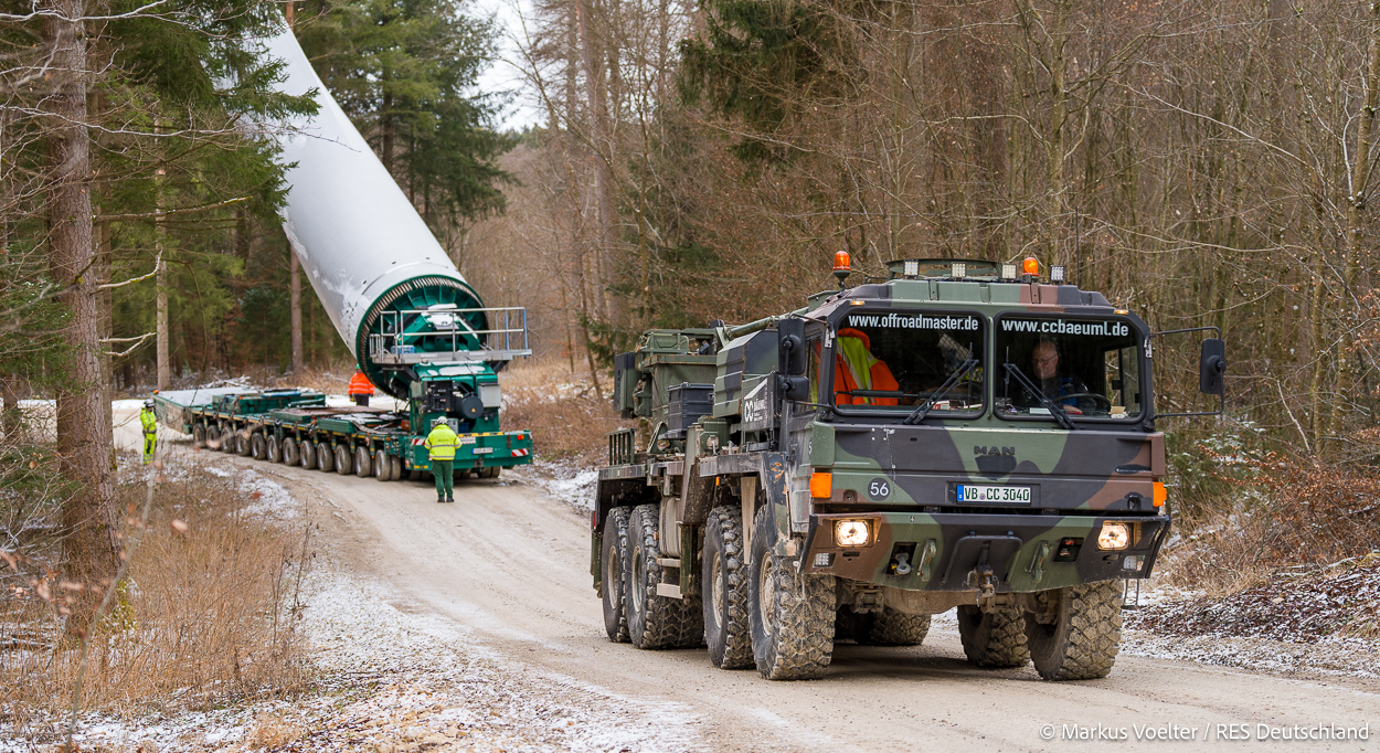 Die Großkomponeten — Turmsegmente, Rotorblätter, Getriebe, etc. — wurden von Schwandner geliefert. Eine "Lieferung" mit drei Rotorblättern und einem Getriebe hat an der Behelfsausfahrt Hohenstadt auf der Alb eine Zwangspause eingelegt, weil die Landstrassen zu glatt waren. Da habe ich die LKW früh morgens erwischt. Es handelte sich um drei Volvo FH16 mit 750 PS, mit Schwerlastturm von Popp Fahrzeugbau. Zum Transport der 81 m langen Rotorblätter an sich kamen Fahrzeuge von Goldhofer zum Einsatz. Der 10-achsige Tieflader für das Getriebe war ein Modell von Broshuis.