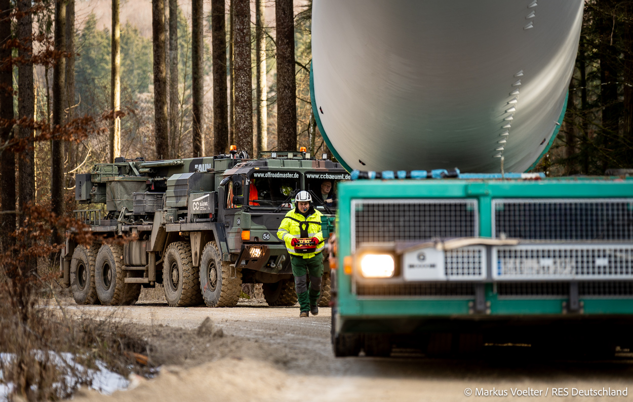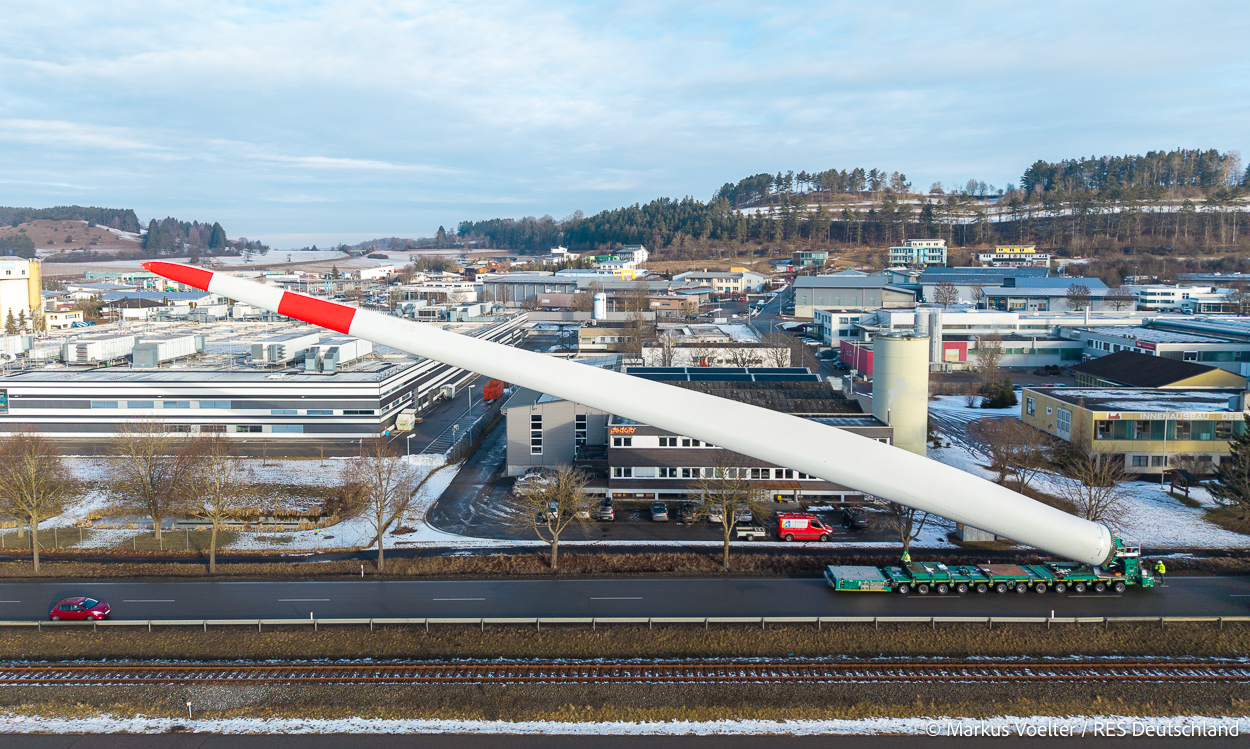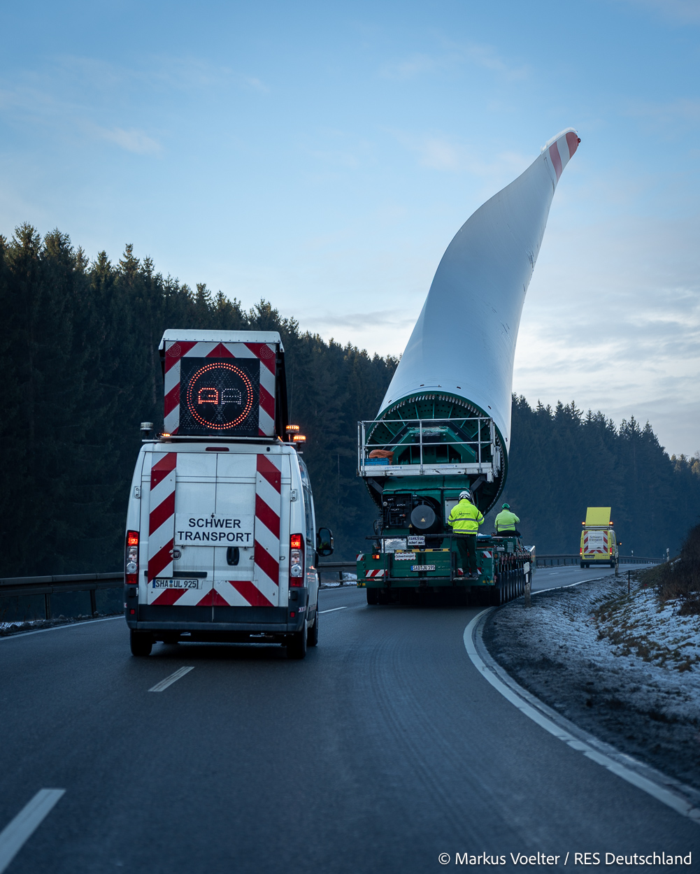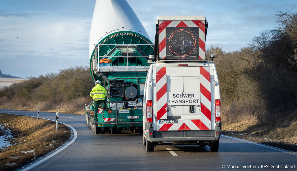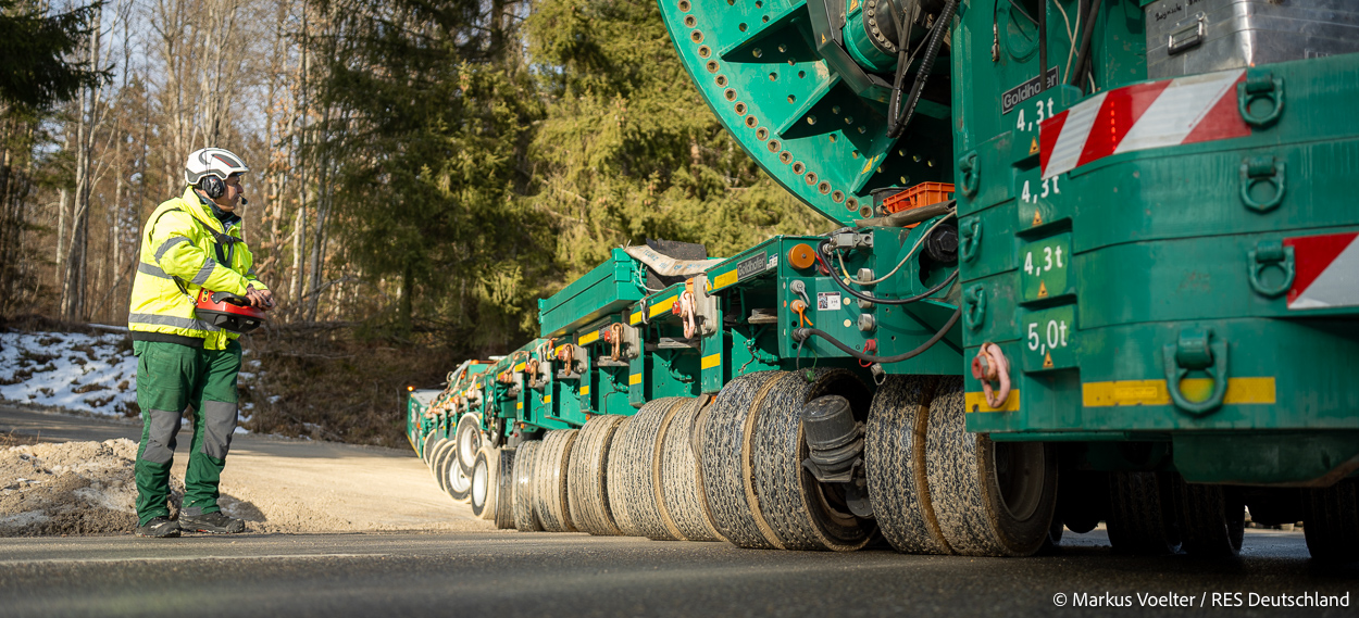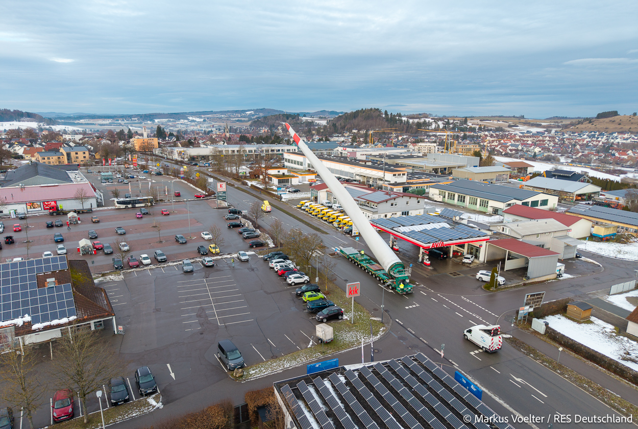 Die Großkomponeten — Turmsegmente, Rotorblätter, Getriebe, etc. — wurden von Schwandner geliefert. Eine "Lieferung" mit drei Rotorblättern und einem Getriebe hat an der Behelfsausfahrt Hohenstadt auf der Alb eine Zwangspause eingelegt, weil die Landstrassen zu glatt waren. Da habe ich die LKW früh morgens erwischt. Es handelte sich um drei Volvo FH16 mit 750 PS, mit Schwerlastturm von Popp Fahrzeugbau. Zum Transport der 81 m langen Rotorblätter an sich kamen Fahrzeuge von Goldhofer zum Einsatz. Der 10-achsige Tieflader für das Getriebe war ein Modell von Broshuis.
