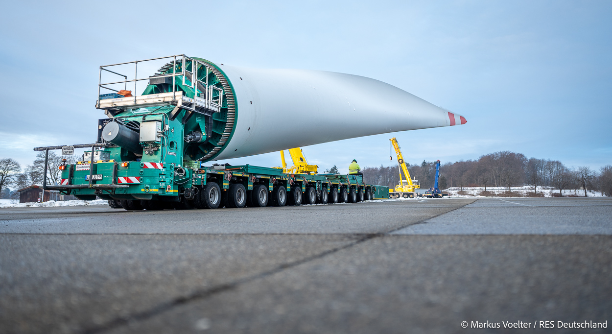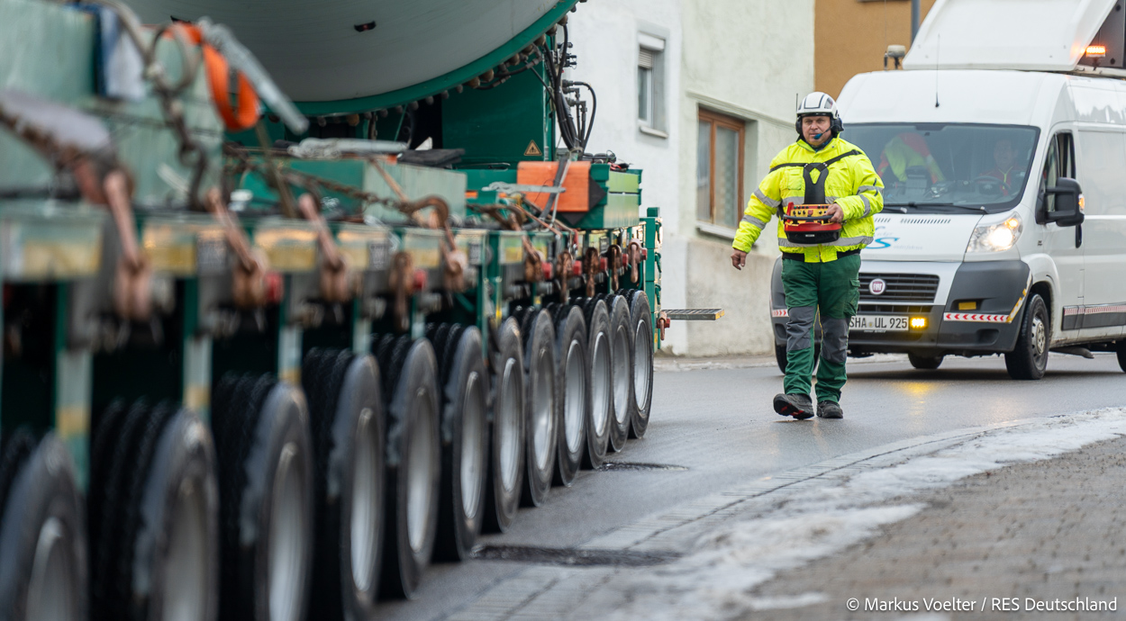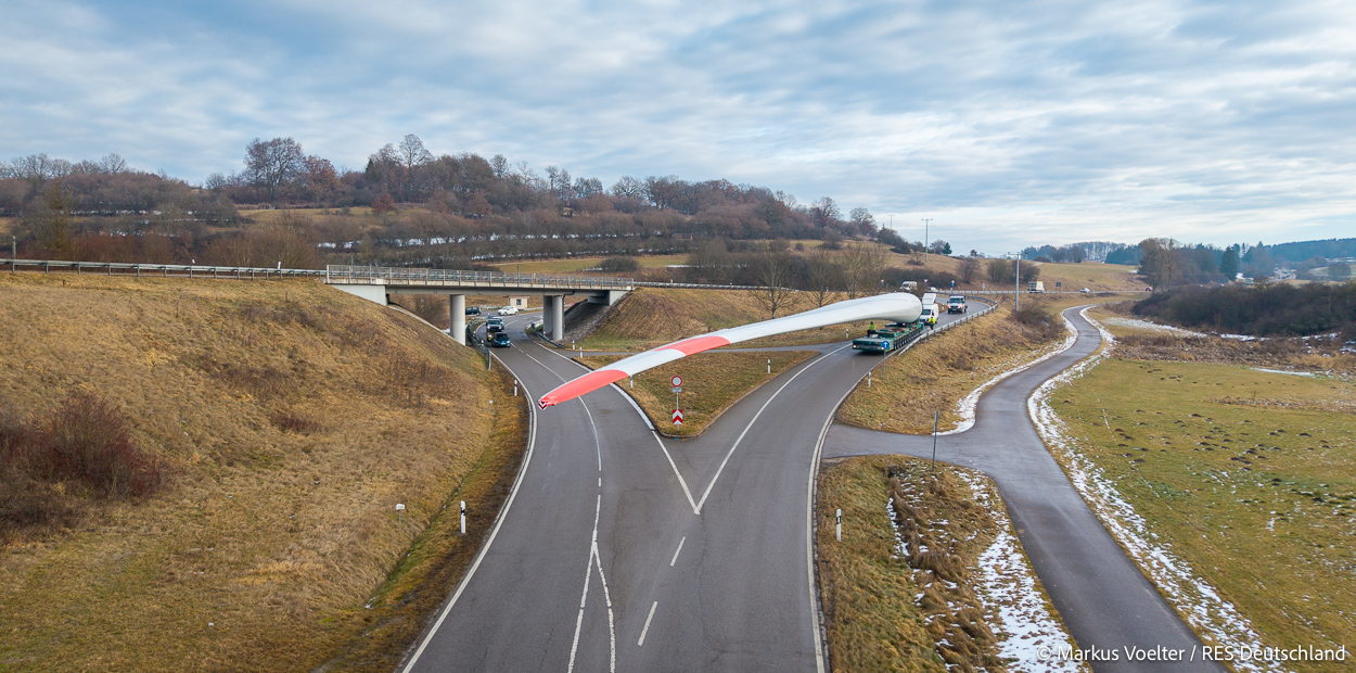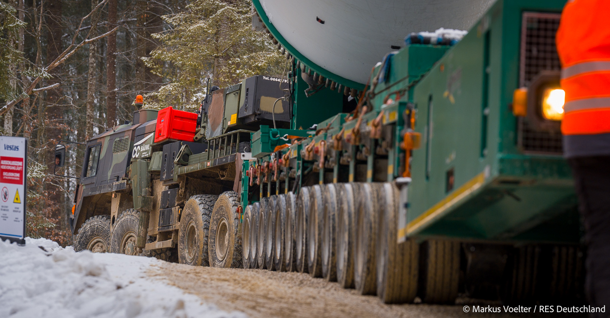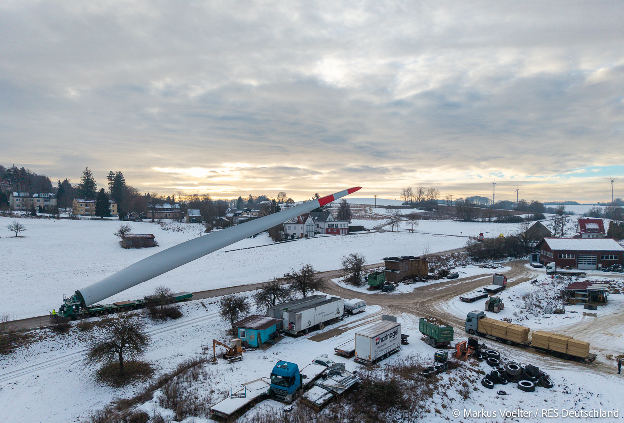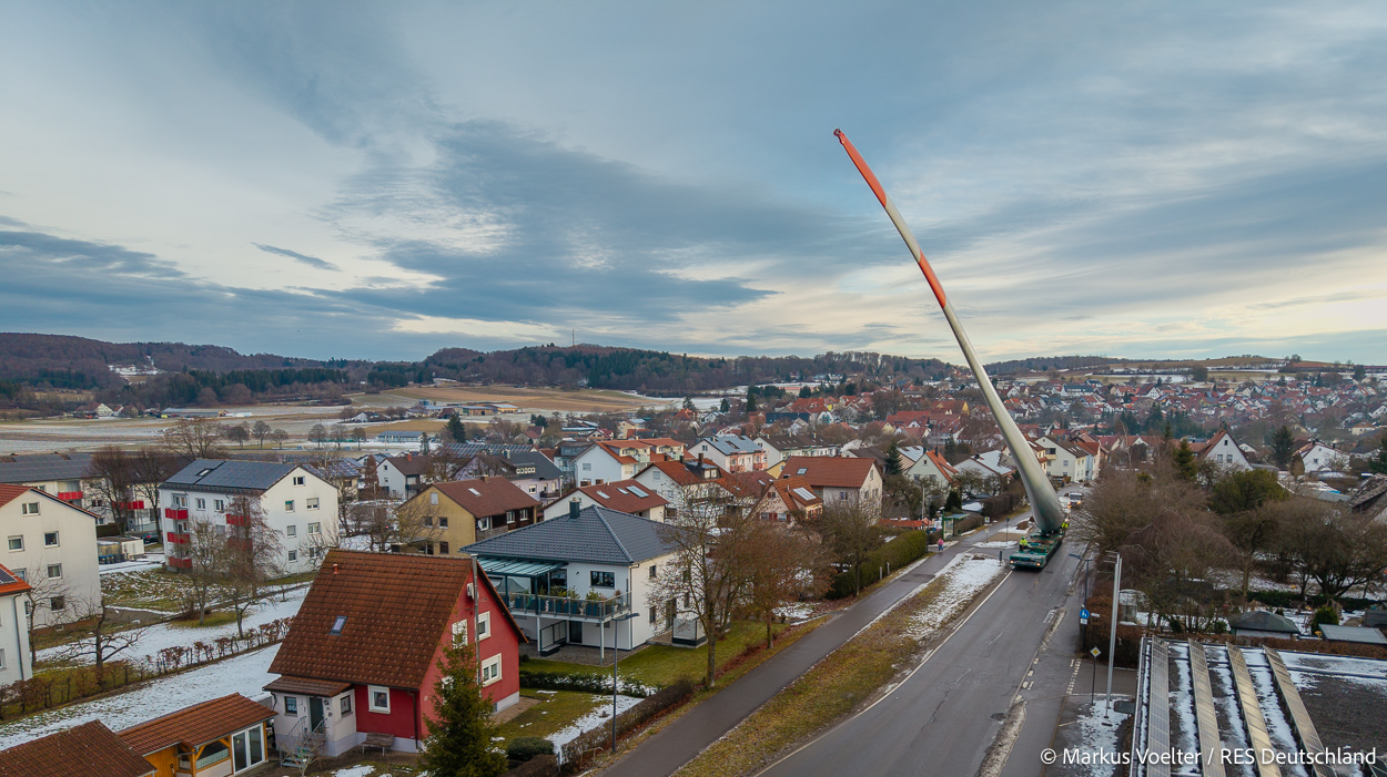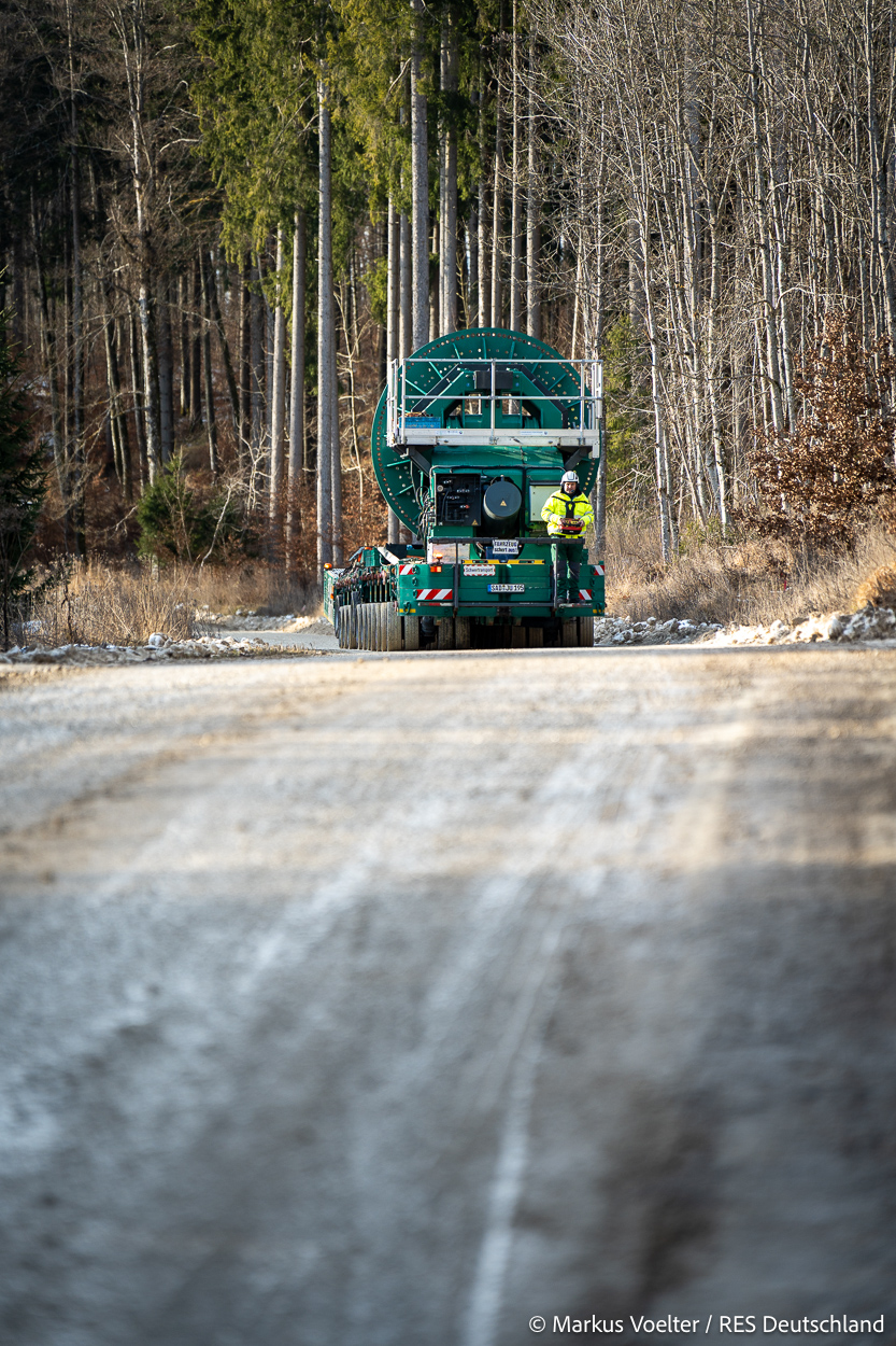 Die Großkomponeten — Turmsegmente, Rotorblätter, Getriebe, etc. — wurden von Schwandner geliefert. Eine "Lieferung" mit drei Rotorblättern und einem Getriebe hat an der Behelfsausfahrt Hohenstadt auf der Alb eine Zwangspause eingelegt, weil die Landstrassen zu glatt waren. Da habe ich die LKW früh morgens erwischt. Es handelte sich um drei Volvo FH16 mit 750 PS, mit Schwerlastturm von Popp Fahrzeugbau. Zum Transport der 81 m langen Rotorblätter an sich kamen Fahrzeuge von Goldhofer zum Einsatz. Der 10-achsige Tieflader für das Getriebe war ein Modell von Broshuis.