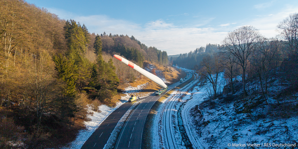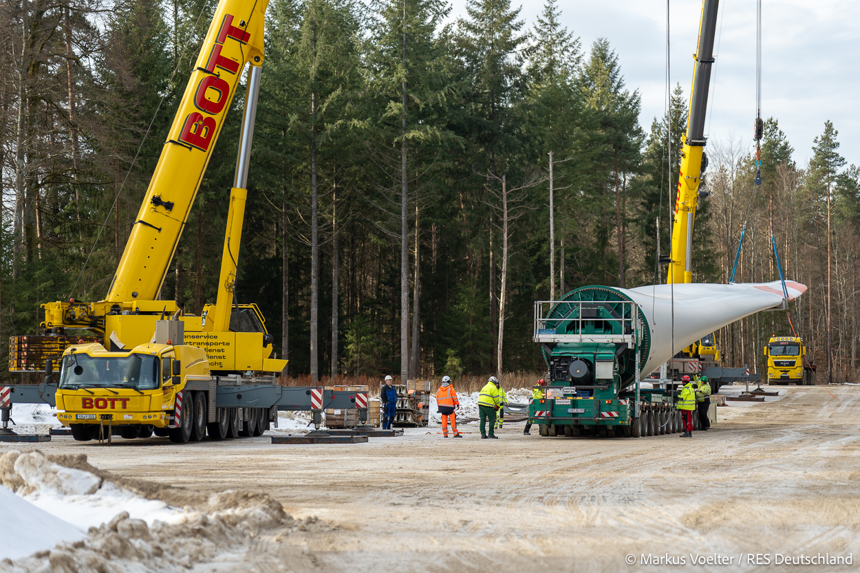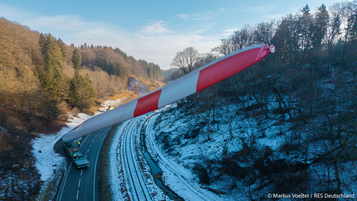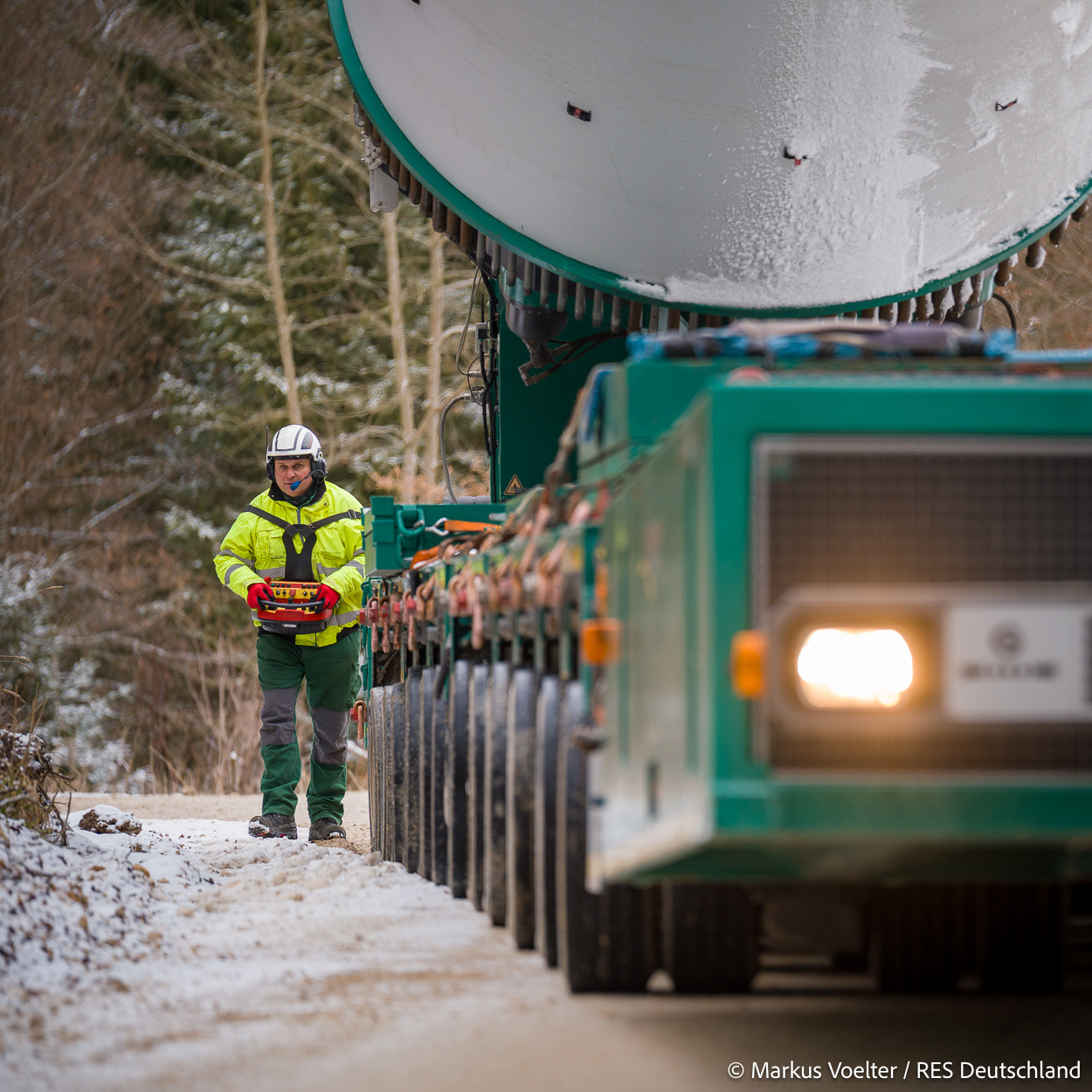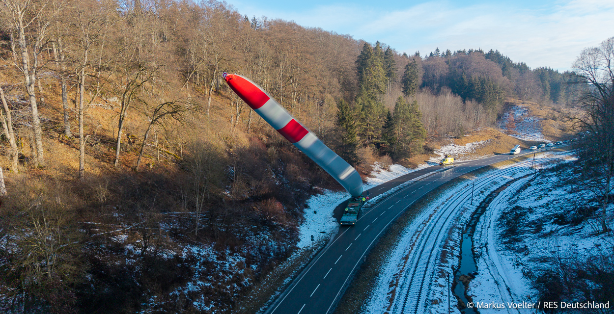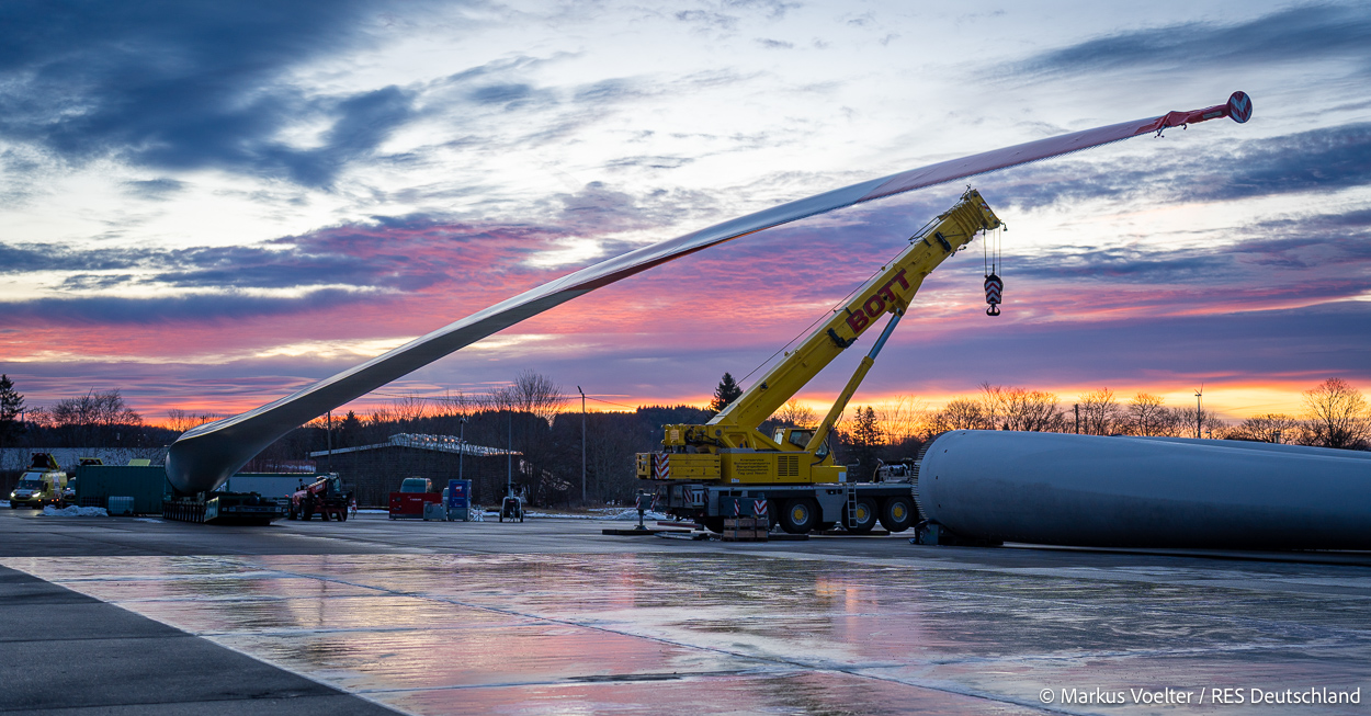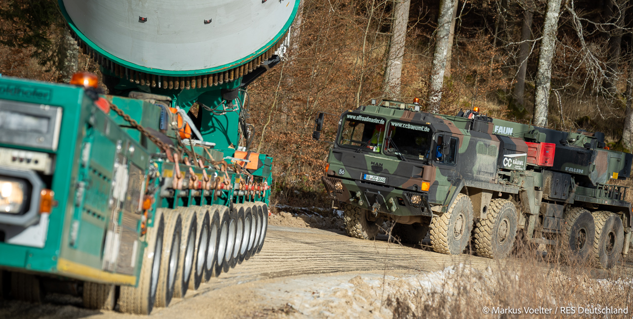 Die Großkomponeten — Turmsegmente, Rotorblätter, Getriebe, etc. — wurden von Schwandner geliefert. Eine "Lieferung" mit drei Rotorblättern und einem Getriebe hat an der Behelfsausfahrt Hohenstadt auf der Alb eine Zwangspause eingelegt, weil die Landstrassen zu glatt waren. Da habe ich die LKW früh morgens erwischt. Es handelte sich um drei Volvo FH16 mit 750 PS, mit Schwerlastturm von Popp Fahrzeugbau. Zum Transport der 81 m langen Rotorblätter an sich kamen Fahrzeuge von Goldhofer zum Einsatz. Der 10-achsige Tieflader für das Getriebe war ein Modell von Broshuis.