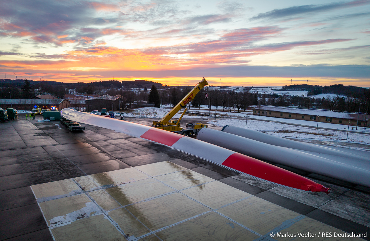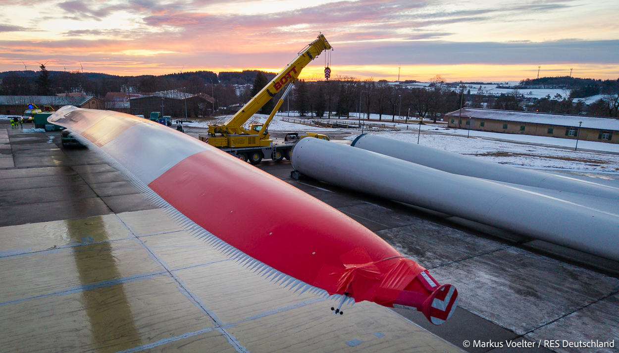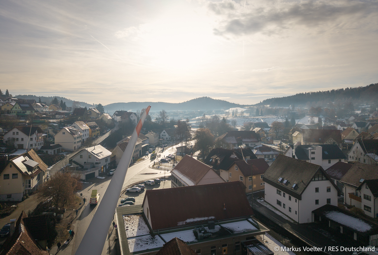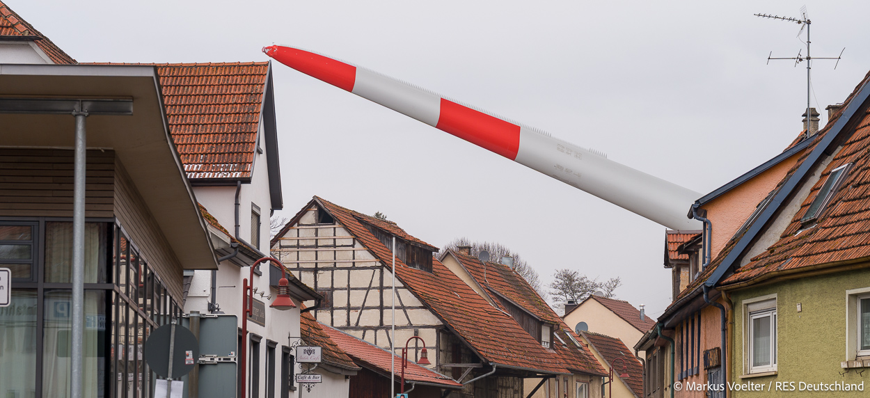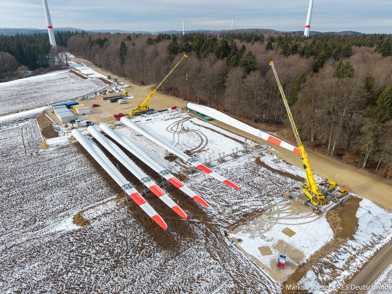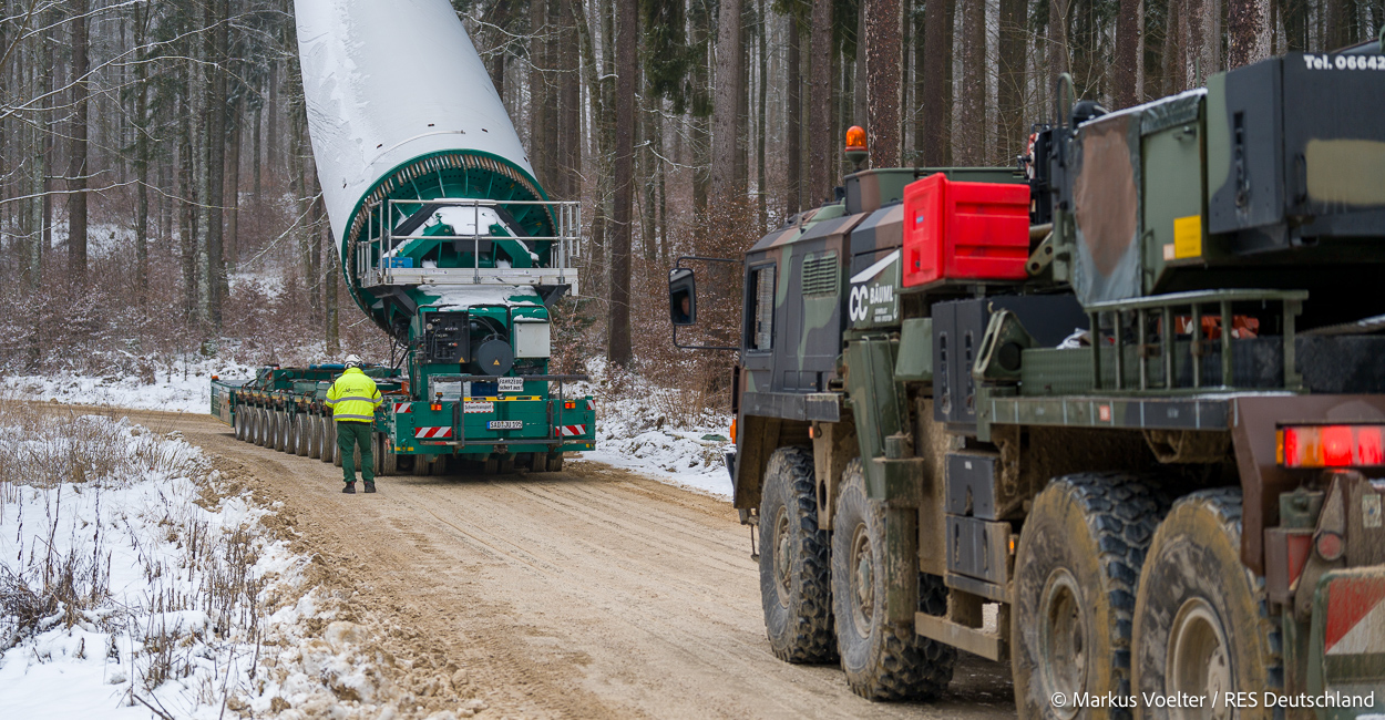 Die Großkomponeten — Turmsegmente, Rotorblätter, Getriebe, etc. — wurden von Schwandner geliefert. Eine "Lieferung" mit drei Rotorblättern und einem Getriebe hat an der Behelfsausfahrt Hohenstadt auf der Alb eine Zwangspause eingelegt, weil die Landstrassen zu glatt waren. Da habe ich die LKW früh morgens erwischt. Es handelte sich um drei Volvo FH16 mit 750 PS, mit Schwerlastturm von Popp Fahrzeugbau. Zum Transport der 81 m langen Rotorblätter an sich kamen Fahrzeuge von Goldhofer zum Einsatz. Der 10-achsige Tieflader für das Getriebe war ein Modell von Broshuis.