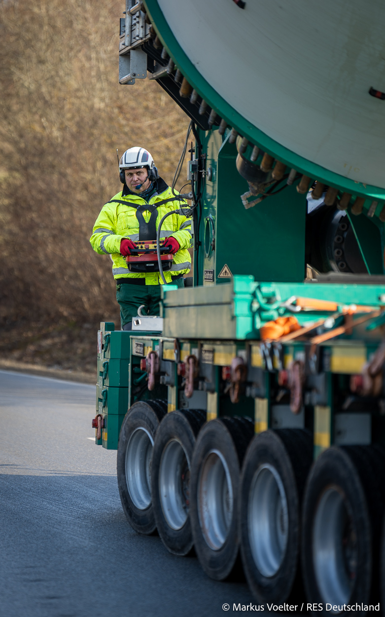 Auch der SPMT-Transport wird von Schwandner durchgeführt. Bei der Grundmaschine handelt es sich um ein 12-achsige Goldhofer PSTSLE; als Powerpack ist ein Deutz V6 530PS verbaut. Darauf instaliert ist eine Flügeltransport-Vorrichtung FTV 550+ mit Adapter für Rotorblätter bis zu 85m Länge und 3,65m Durchmesser. Gefahren wird das Gefährt von Manuel Deistler und seinem Kollegen Ralph.