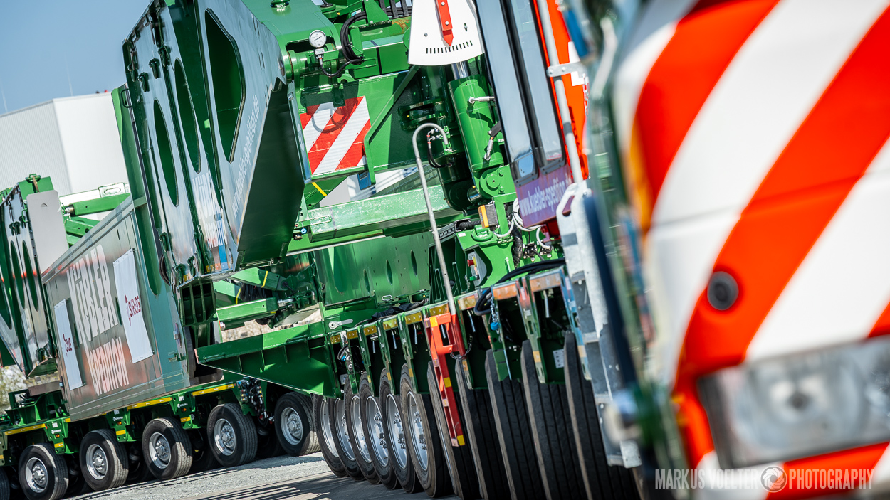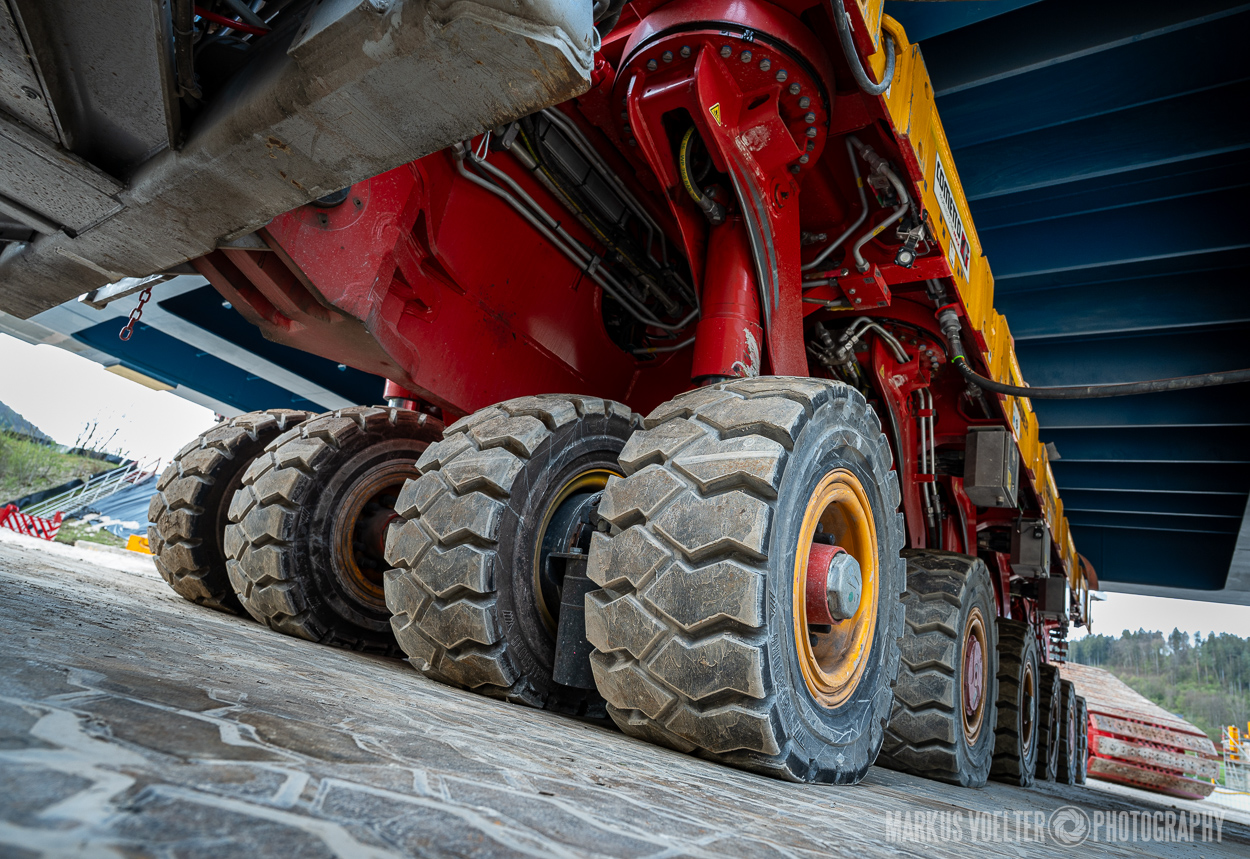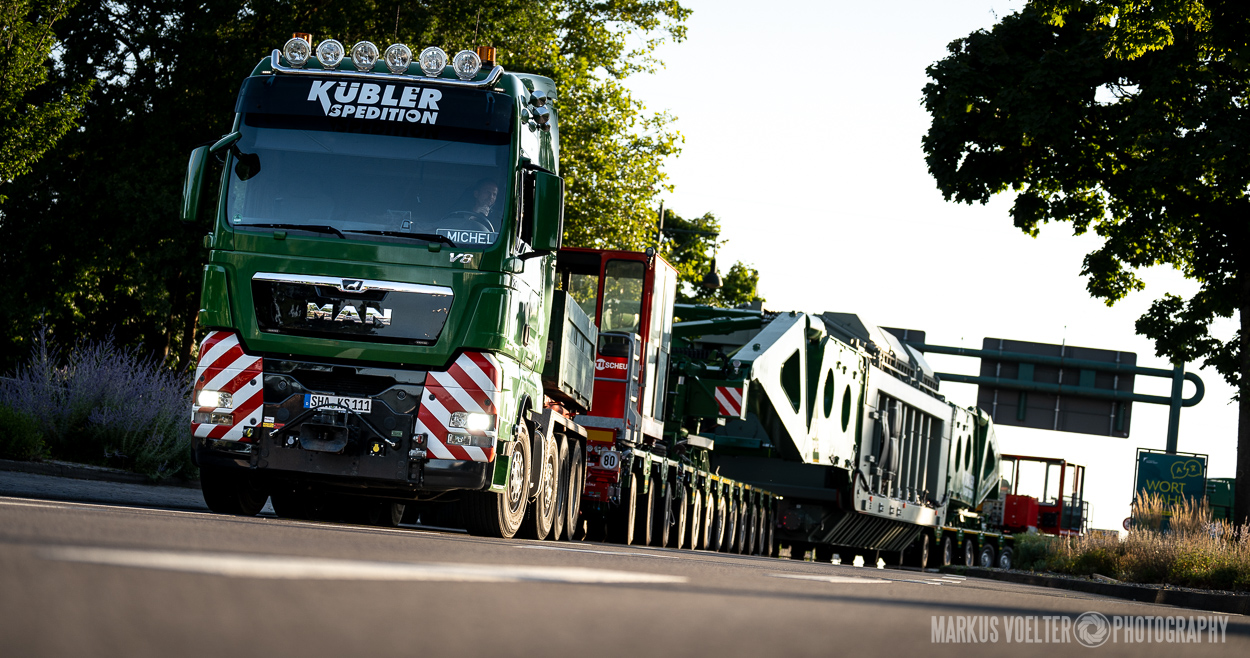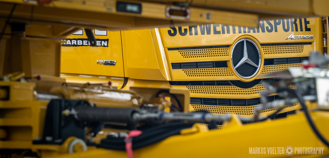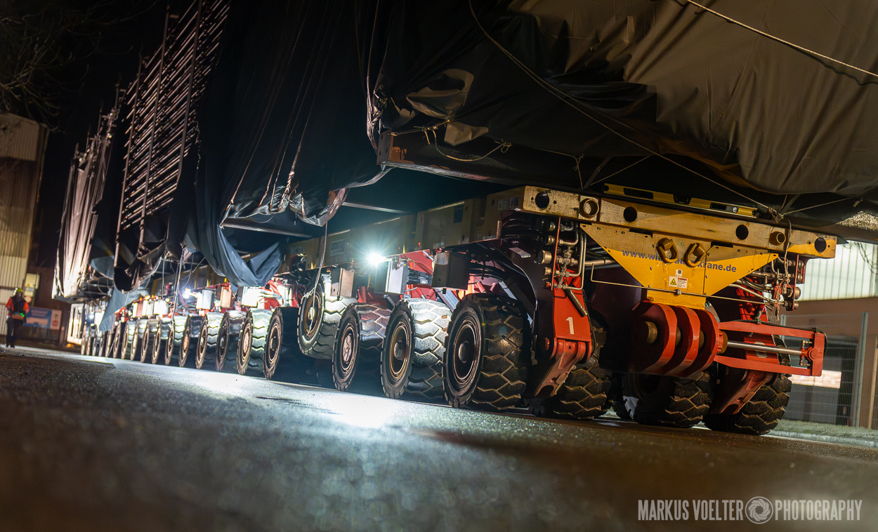 Wie bei den Kranen auch ist die Kombination von groß und schwer einserseits und präzise andererseits reizvoll. Ein spezifischer Aspekt ist, dass man oft viel vom gleichen hat: also bspw. viele Achsen. Das kann zu spannenden Motiven führen. Herausfordernd ist, dass das Motiv lang und dünn ist; formatfüllende Bilder zu machen bedarf Kreativität. Außerdem fahren viele Schwertransporte nachts, was die Fotografiererei auch nicht einfacher macht (lange Belichtungszeiten, Verwackelung, Bildrauschen.