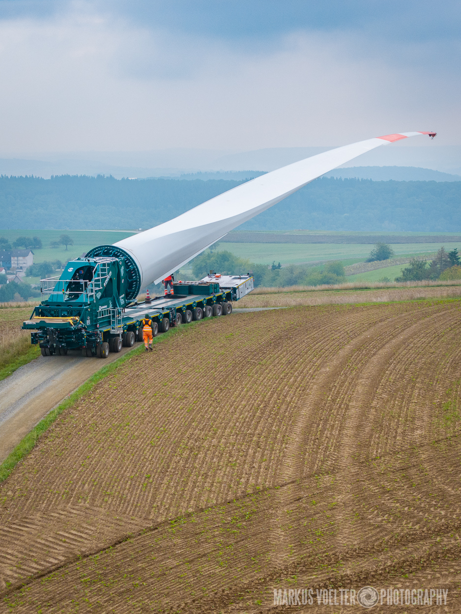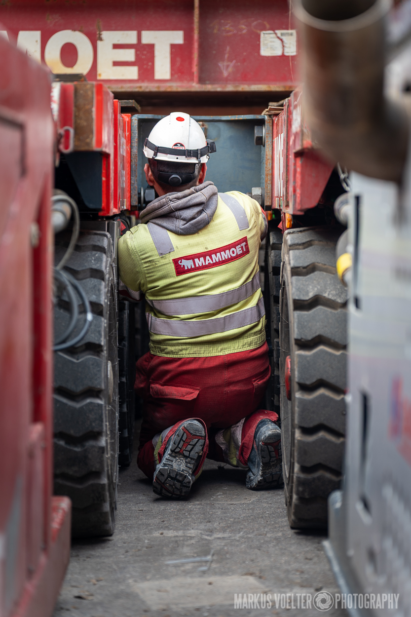 Wie bei den Kranen auch ist die Kombination von groß und schwer einserseits und präzise andererseits reizvoll. Ein spezifischer Aspekt ist, dass man oft viel vom gleichen hat: also bspw. viele Achsen. Das kann zu spannenden Motiven führen. Herausfordernd ist, dass das Motiv lang und dünn ist; formatfüllende Bilder zu machen bedarf Kreativität. Außerdem fahren viele Schwertransporte nachts, was die Fotografiererei auch nicht einfacher macht (lange Belichtungszeiten, Verwackelung, Bildrauschen. Ich habe übrigens auch eine spezifische Sammlung von Nachtbildern.