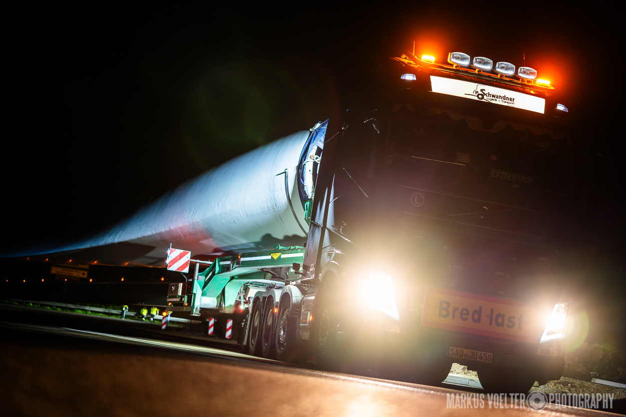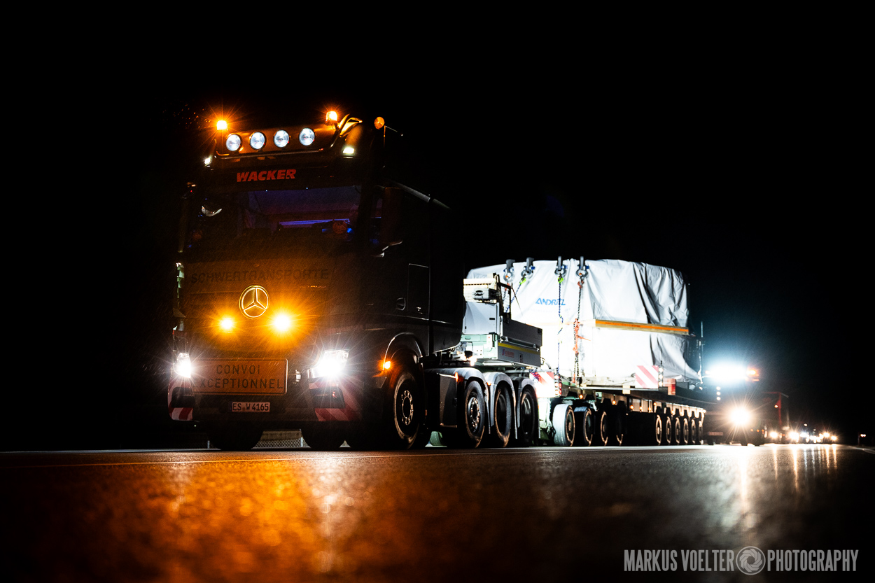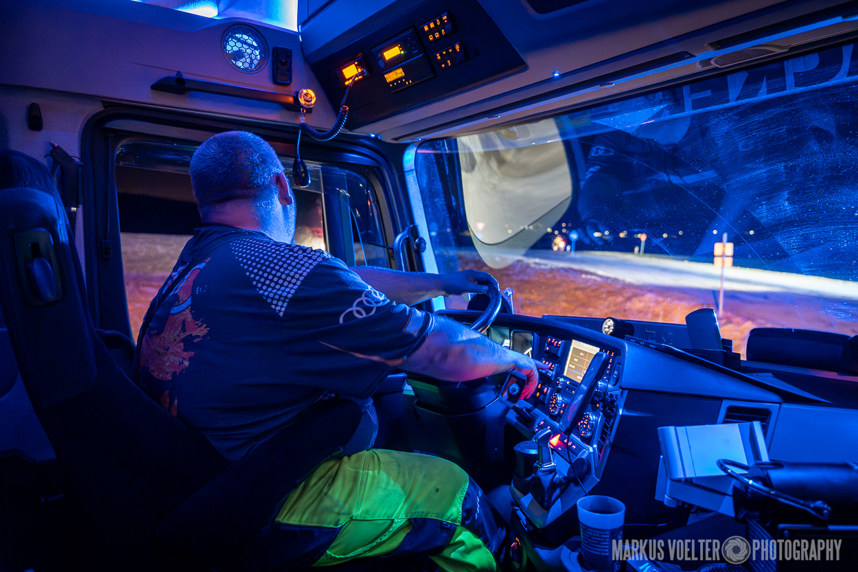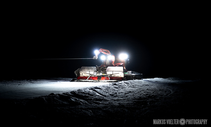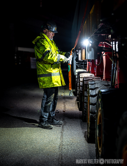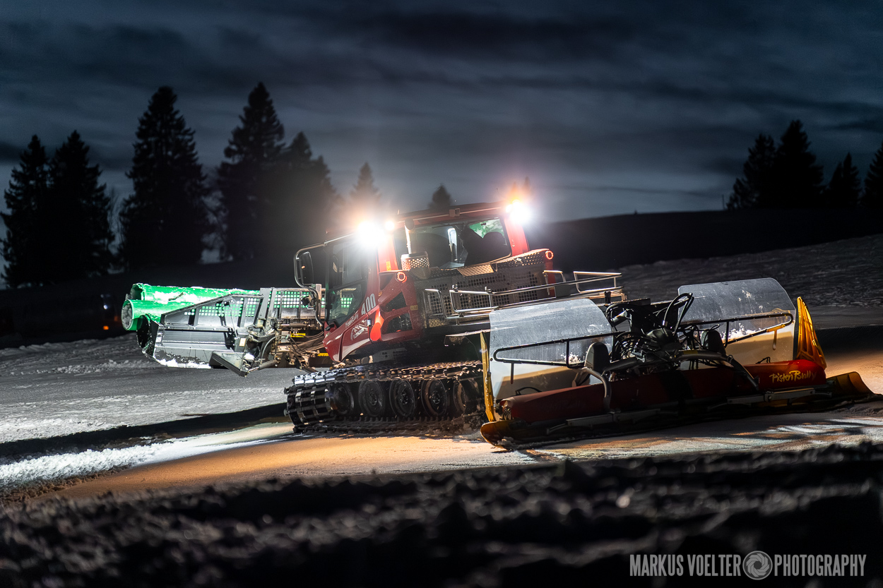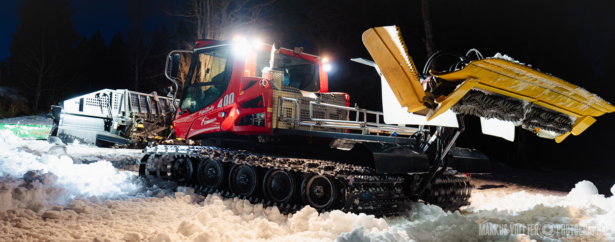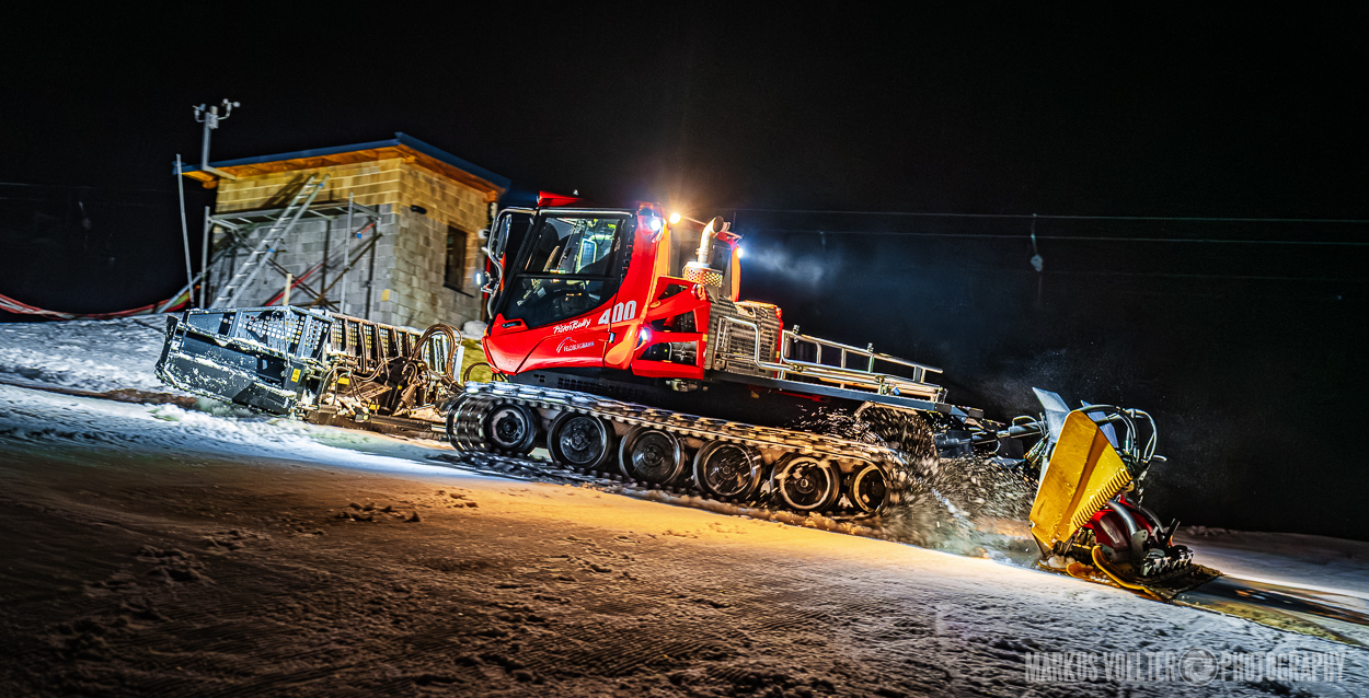 Grade im Bereich Schwertransport und teils auch auf Großbaustellen passiert viel nachts. Aber auch andere Branchen, wie beispielsweise die Präparation von Skipisten, sind nachtaktiv. Fotografisch ist das nicht ohne: lange Belichtungszeiten und resultierende Bewegungsunschärfe sind offensichtlich. Aber nachts sind bekanntlich auch alle Katzen schwarz; Farben sind eine Herausforderung. Gleiches gilt für Scheinwerfer und insbesondere Gegenlicht. Oft liegt die Lösung in der kreativen Bearbeitung der Bilder.