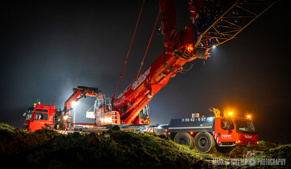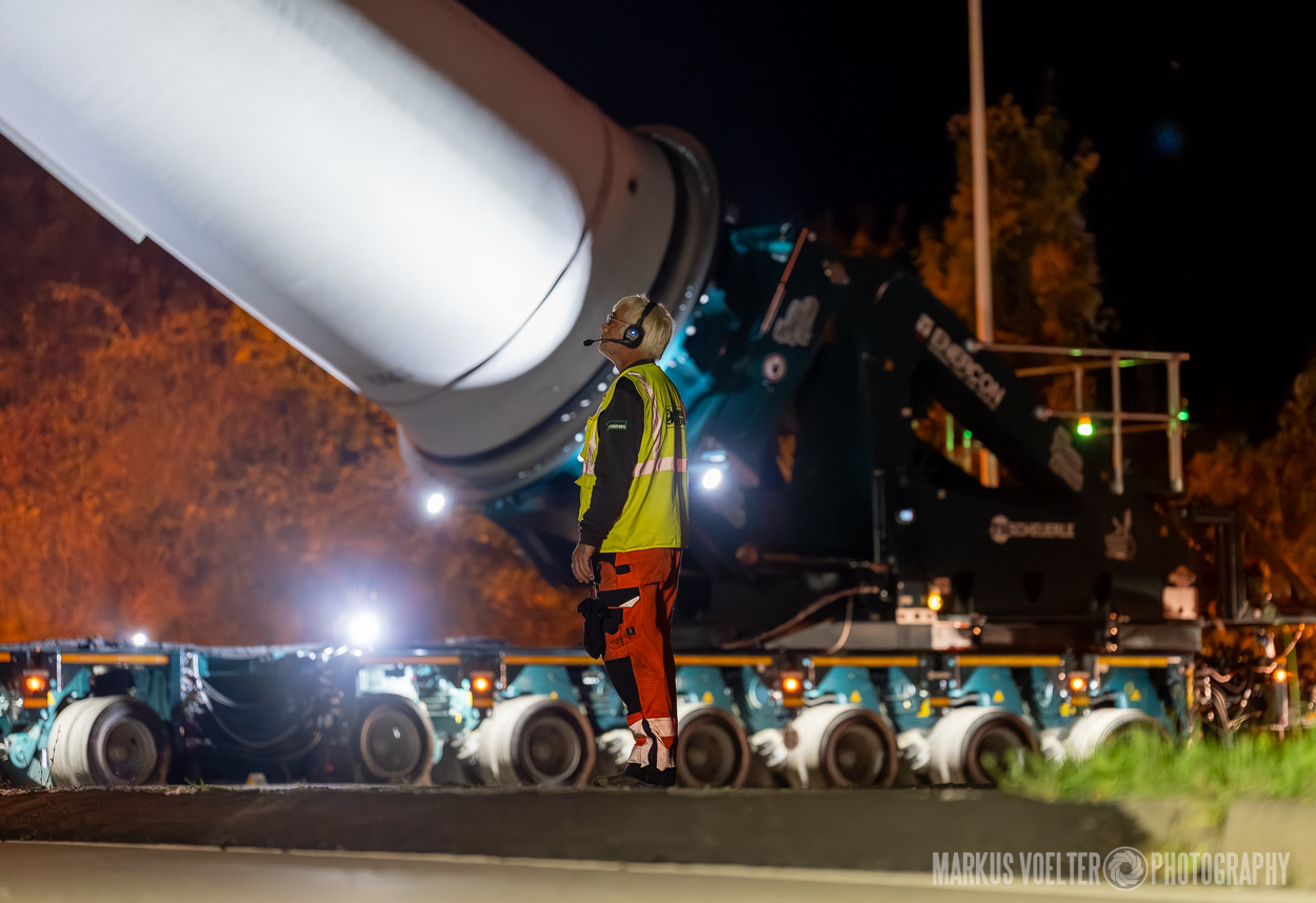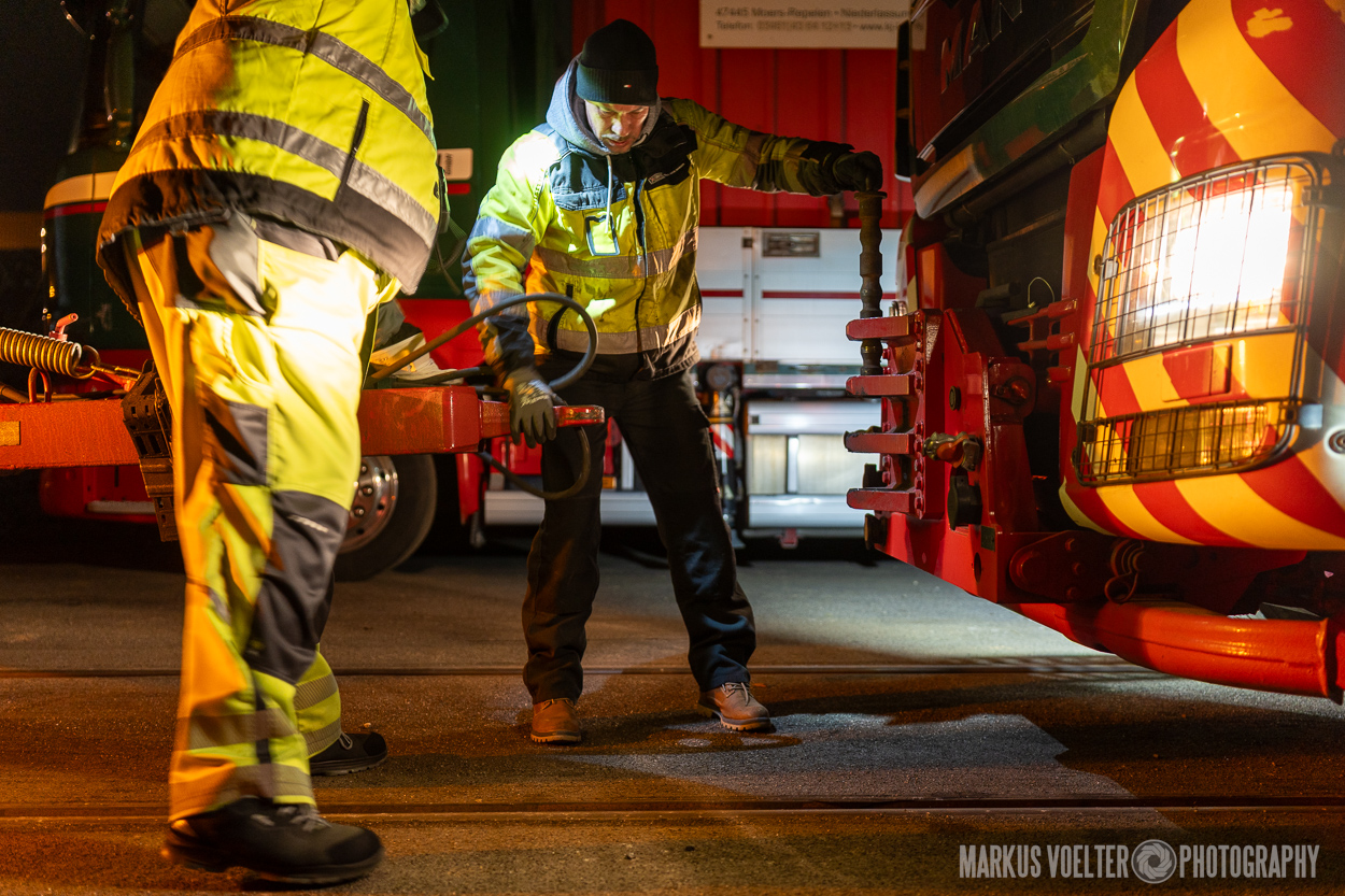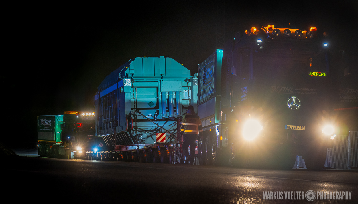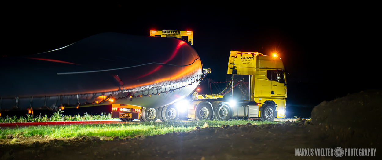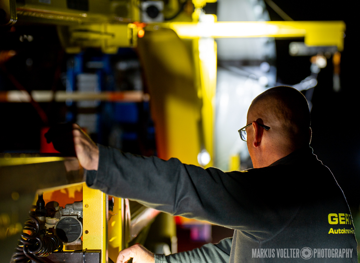 Grade im Bereich Schwertransport und teils auch auf Großbaustellen passiert viel nachts. Aber auch andere Branchen, wie beispielsweise die Präparation von Skipisten, sind nachtaktiv. Fotografisch ist das nicht ohne: lange Belichtungszeiten und resultierende Bewegungsunschärfe sind offensichtlich. Aber nachts sind bekanntlich auch alle Katzen schwarz; Farben sind eine Herausforderung. Gleiches gilt für Scheinwerfer und insbesondere Gegenlicht. Oft liegt die Lösung in der kreativen Bearbeitung der Bilder.