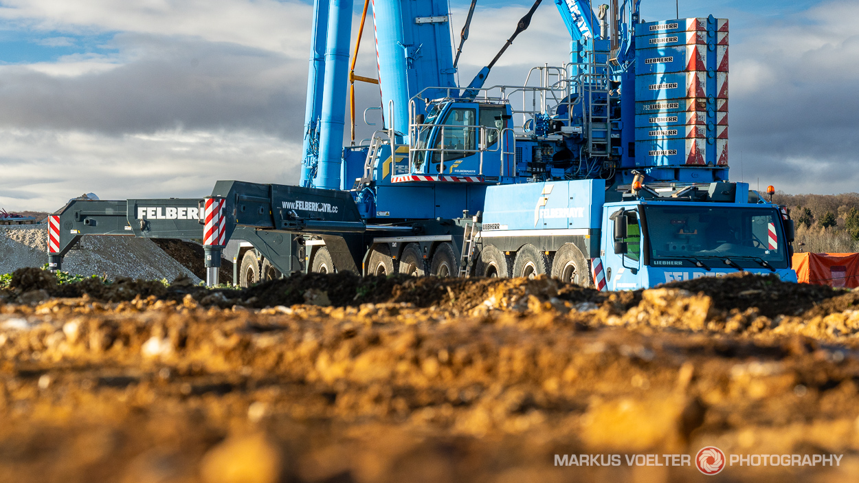 Die Österreichische Schwerlastfirma Felbermayr kommt nicht alle Tage nach Deutschland. Kürzlich habe ich deren LTM 1750 auf der Alb im Windpark Magolsheim gefunden, wo Schöller mit Enercon sechs E-175 mit je 6 MW aufbaut.