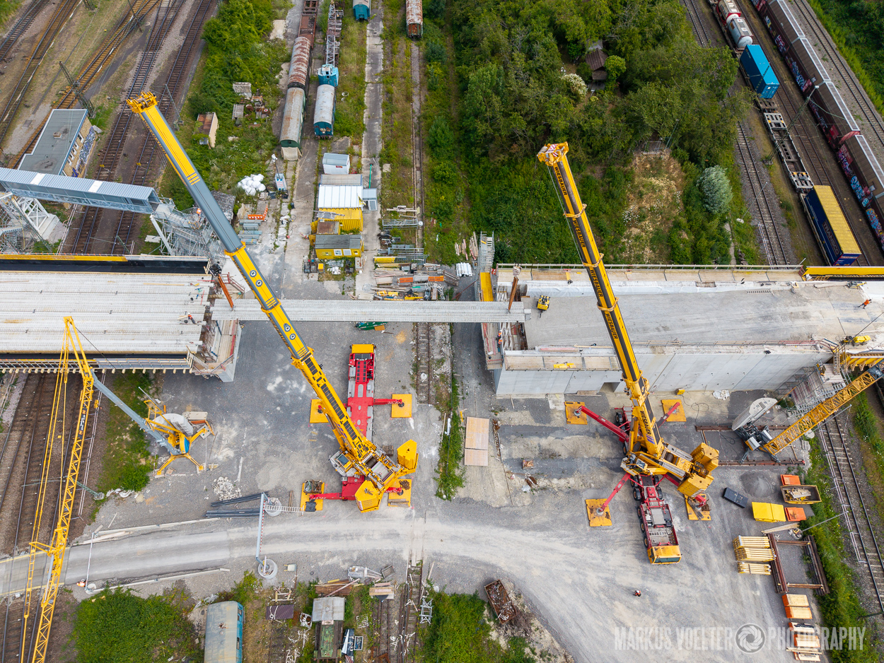 Generell ist Leonhard Weiss GU für den Bau der Brücke. Wiesbauer war für die Kranarbeiten unterbeauftragt; da deren Raupe bei einer anderen Baustelle feststeckte, hat Wiesbauer den Emil Egger beauftragt. Die Träger hat Scheder von Bögl's Werk nach Kornwestheim gefahren.