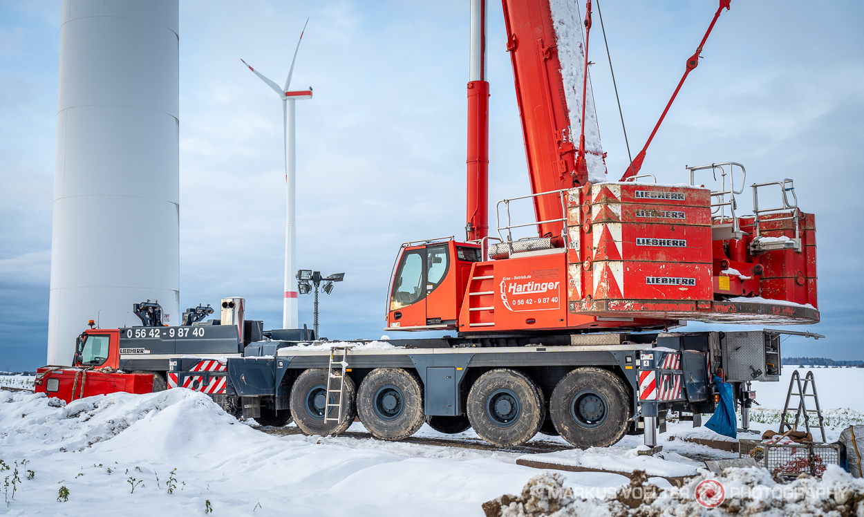 Anfang November bin ich ein paar Platzrunden geflogen mit der Bristell des Vereins. Weit weg geflogen bin ich nicht, das Wetter war nicht sooo toll. Als ich bei Gussenstadt rumgeflogen bin sehe ich unter mir an einer Windkraftanlage einen Kran. Gleich mal etwas tiefer gegangen und zwei, drei Kreise gemacht. Und ein paar Fotos. Auf denen war dann nachher Hartinger lesbar. Ich habe das dann koordiniert und bin ein paarmal vorbeigegangen um den Kran in verschiedenen Bild dann in der Kran und Schwerlast-Facebookgruppe gepostet, und schwupps hat sich der Kranfahrer gemeldet. Mit dem hab ich mich dann abgesprochen und den Kran dann in verschiedenen Situationen fotografiert.