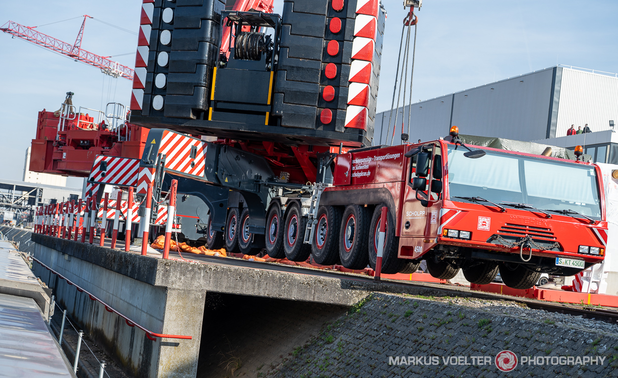 Natürlich war auch der 1650er mit von der Partie – beim Tandemhub auf dem Scholpp-Gelände, wo Pressen auf Binnenschiffe verladen wurden. Bis zu 260 Tonnen Gewicht standen auf dem Plan. Doch der unbestrittene Star der Aktion war der AC-500. Er war wenige Tage zuvor frisch generalüberholt aus dem Tadano-Werk in Zweibrücken zurückgekehrt. Äußerlich war der Unterschied klar: sauber, glänzend, wie neu. Doch auch unter der Oberfläche hatte sich einiges getan – Elektrik, Hydraulik, Zylinder und Winde wurden komplett überarbeitet oder ersetzt. Der AC-500 ist (wieder) ein Kran, der nicht nur durch Leistung, sondern auch durch seine Erscheinung beeindruckt.
