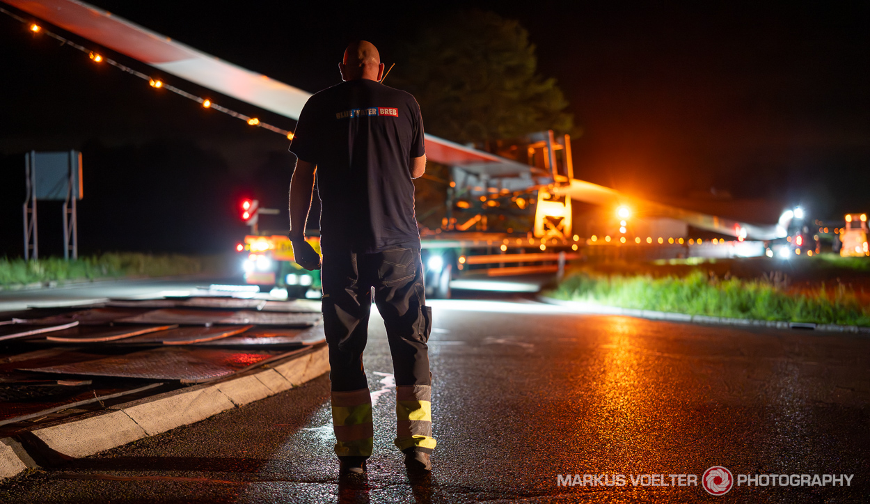 Über den Grund für die Nachtfahrt und die Aufgaben der Begleitfahrzeuge habe ich schon im Post zu Emmi erzählt. Allerdings sind Rotorblätter dann doch eine ganze Ecke länger — um die 70 Meter in diesem Fall — als Emmi's Turmsegment. Und das macht die Sache nochmal ne Ecke interessanter.