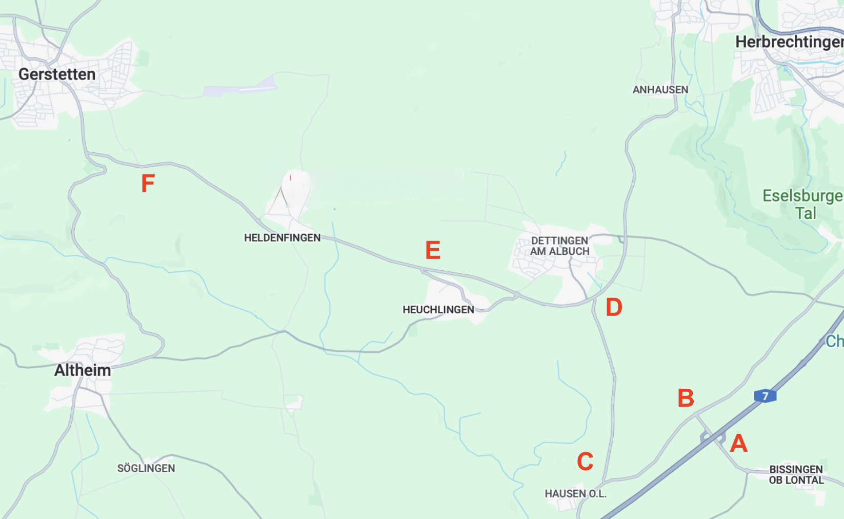 Die LKW fuhren von Süden kommend die A7 entlang, zur Ausfahrt Niederstotzingen (mit A markiert auf der Karte unten). Allerdings konnten sie nicht einfach die normale Ausfahrt runterfahren, denn der Kurvenradius ist zu eng bzw. der Bereich auf der Innenseite der Kurve kann mit dem Blatt nicht ohne weiteres überschwenkt werden. Deswegen sind sie an der Ausfahrt vorbei und dann die Auffahrt rückwärts runter — natürlich alles abgesperrt durch ich-weiß-nicht-wieviele gelb blinkende Begleitfahrzeuge. Die Abzweigung bei B wurde dann vorwärts gefahren. Dazu waren auf der Nordwestseite der Strasse Stahlplatten ausgelegt damit die Transporte einen größeren Kurvenradius fahren können. Die Abzweigung bei C war zu spitz. Auch hier sind die Transporter dran vorbeigefahren und sind dann rückwärts auf die Strasse von C nach D "abgebogen". Die drei km bis C wurden komplett rückwärts gefahren; das klingt für den Laien vermutlich dramatischer als es ist, denn die Transporter können hinten ja lenken, gesteuert vom BF das auch an diesem Ende des Transports fährt. Von D aus ging es dann vorwärts weiter, bis es dann bei F wieder rückwärts auf den Umladeplatz ging. Ein interessantes Detail noch: die Strecke an Heuchlingen vorbei war wegen Strassenbauarbeiten gesperrt; es gab eine Umleitung über Altheim. Freundlicherweise wurde die Baustelle für den Transport "geöffnet", es wurden ein paar hundert Meter Stahlplatten verlegt.