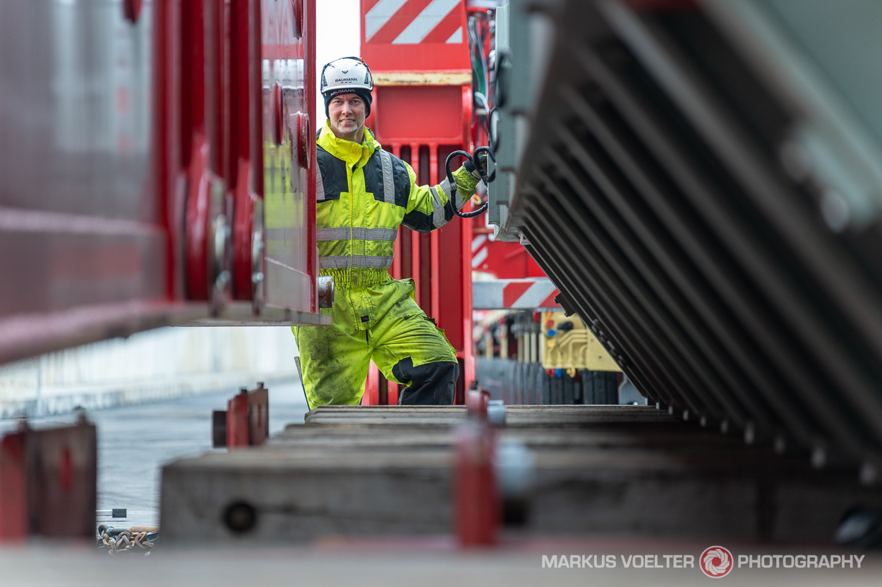 Nächster Morgen. Um 8:00 war ich da. Kein Schiff. Aber gut, es hieß ja auch um 10. Auf Vesselfinder & Co. war aber auch kein Schiff in der Gegend von Schwedt zu sehen. Seltsam. Nervosität. Anrufe bei der Dispo. Doch, es bleibt bei 10. Um 10:00 war da ... kein Schiff. Um 10:35 bog es dann tatsächlich um die Hafenmauer und machte direkt unter dem Kran fest. Alle waren erleichtert ... ich auch, wenn ich musste abends wirklich heim und ich wollte nicht umsonst die 2 x 750 km gefahren sein ... verrückt genug die Aktion! {% storytextcell Wenige Minuten später hatte Silvio den Kran und die Anschlagmittel über das Schiff gedreht und Joachim und Kollege kletterten auf den Trafo um ihn festzumachen. Grade mal eine Stunde nach Ankunft des Schiffs begann sich der 335 Tonnen schwere Trafo langsam aber stetig nach oben zu bewegen.