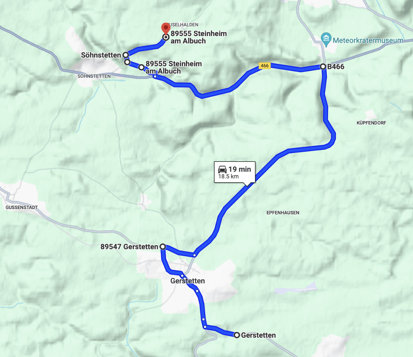 Beim hiesigen Transport wurden die Rotorblätter für die Windkraftanlagen bei Gnannenweiler angeliefert (den Bau der Anlagen hatte ich hier beschrieben). Letztendlich kamen die Rotorblätter wie auch schon der Tranport der Turmsegmente von der Autobahn, via der Ausfahrt in Niederstotzingen. Allerdings haben es die Transporter aufgrund der größeren Länge nicht durch die Ortschaft Gerstetten geschafft. Stattdessen wurden die Blätter zwischen Heuchlingen und Gerstetten von den LKWs abgeladen und von dort dann per SPMT und Bladelifter nach Gnannenweiler geschafft. Hier ist die Karte mit der Strecke: