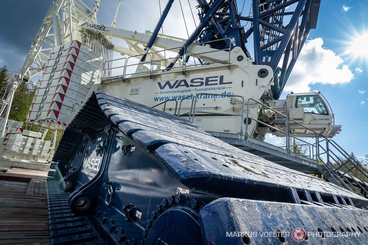 Zurück zur Technik :-) Wasel hat drei LR 11000. Ich vermute, mehr hat in Deutschland keiner (Mammoet und/oder Sarens in den Niederlanden haben vermutlich mehr). Und zwei davon stehen grade im Windpark Sulzbach. Der den ich fotografiert habe kam direkt aus dem Werk; auf den Ballastplatten waren noch Lieferscheine draufgeklebt mit "Wasel, Windpark, Sulzbach".